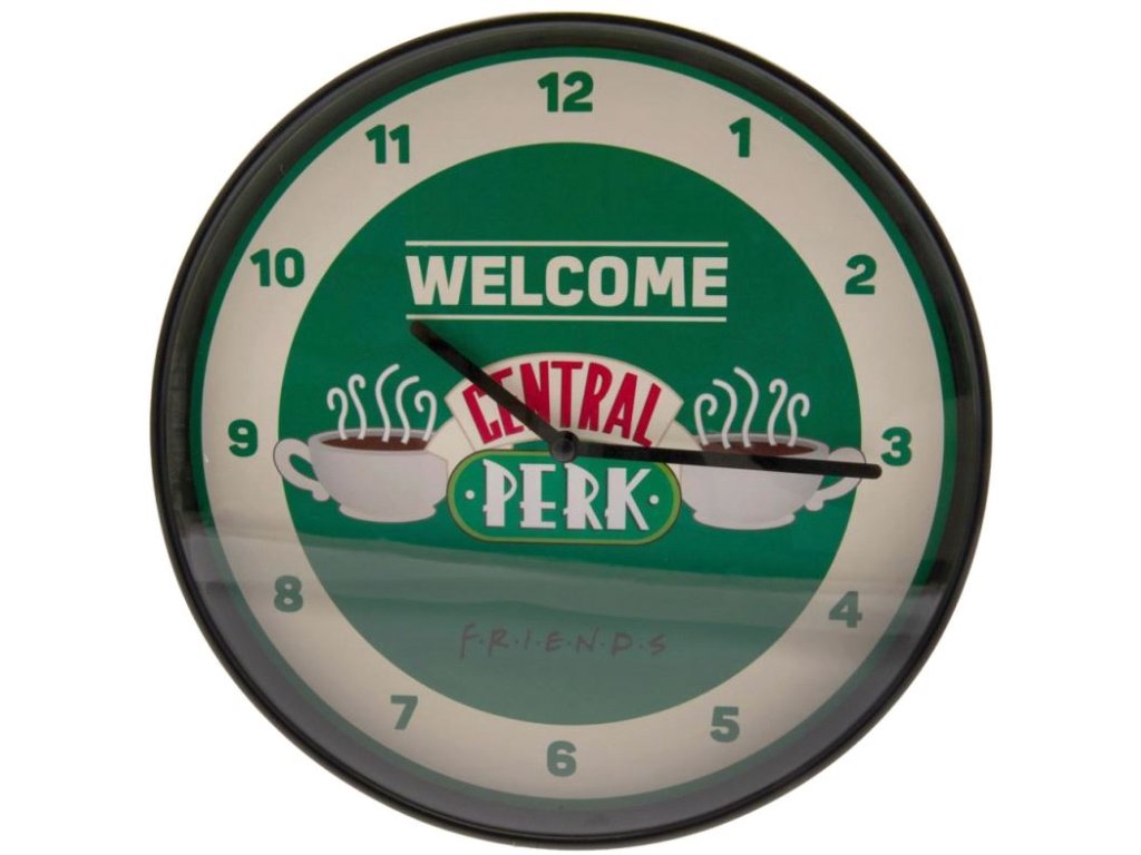 Kulaté plastové nástěnné hodiny s motivem a logem Central Perk - Friends. Hodiny vhodné do každého pokoje všech fanoušků seriálu!