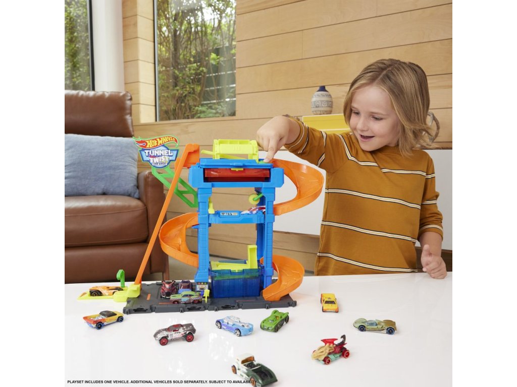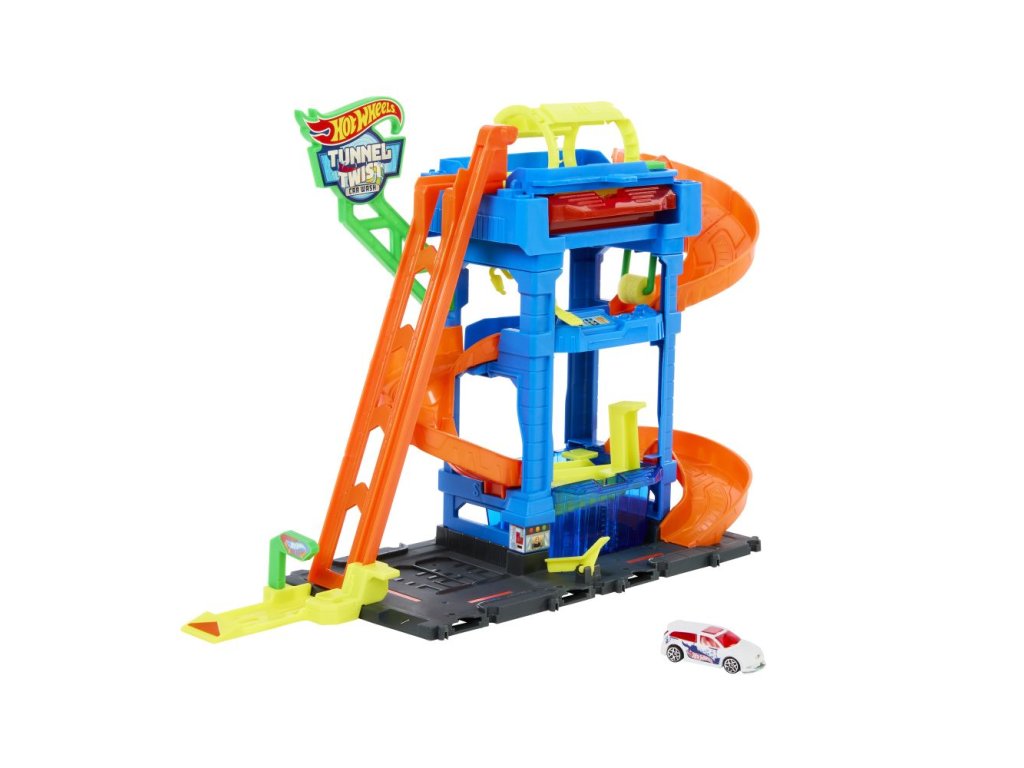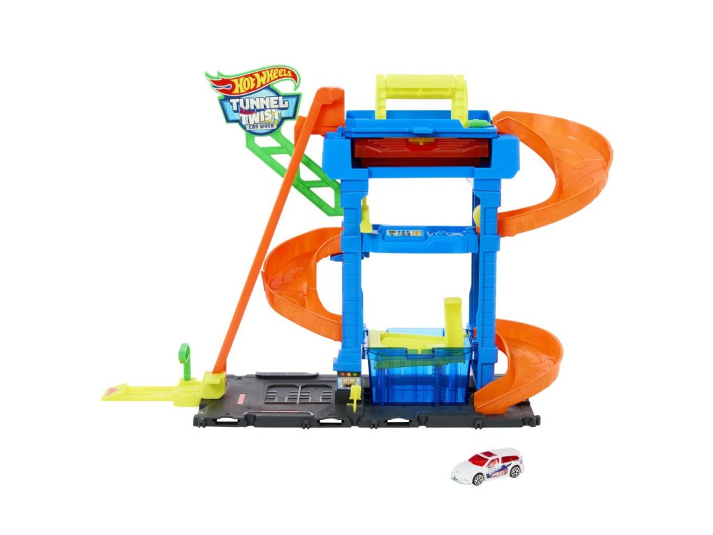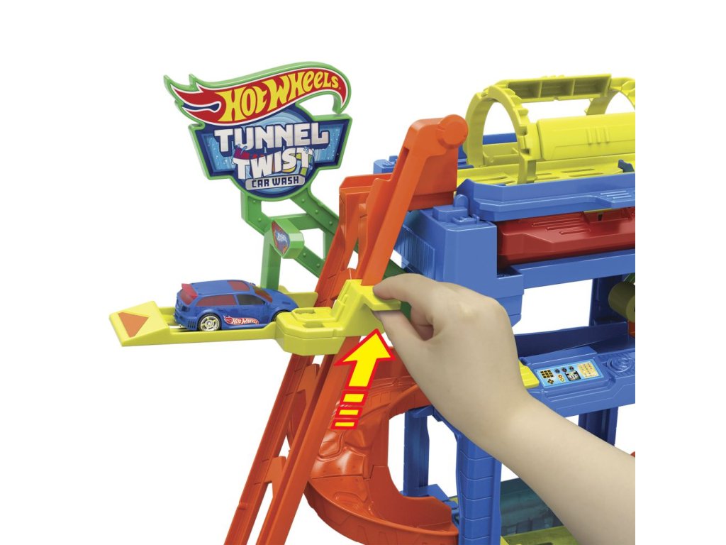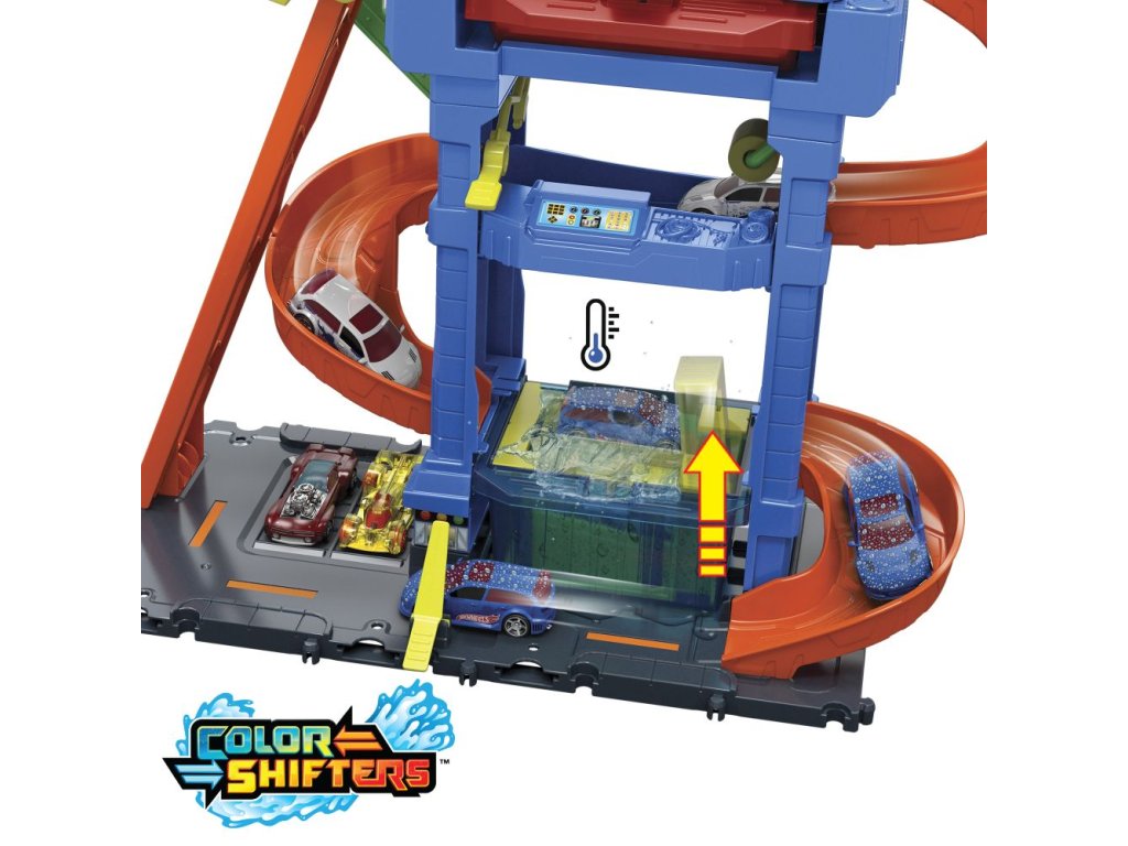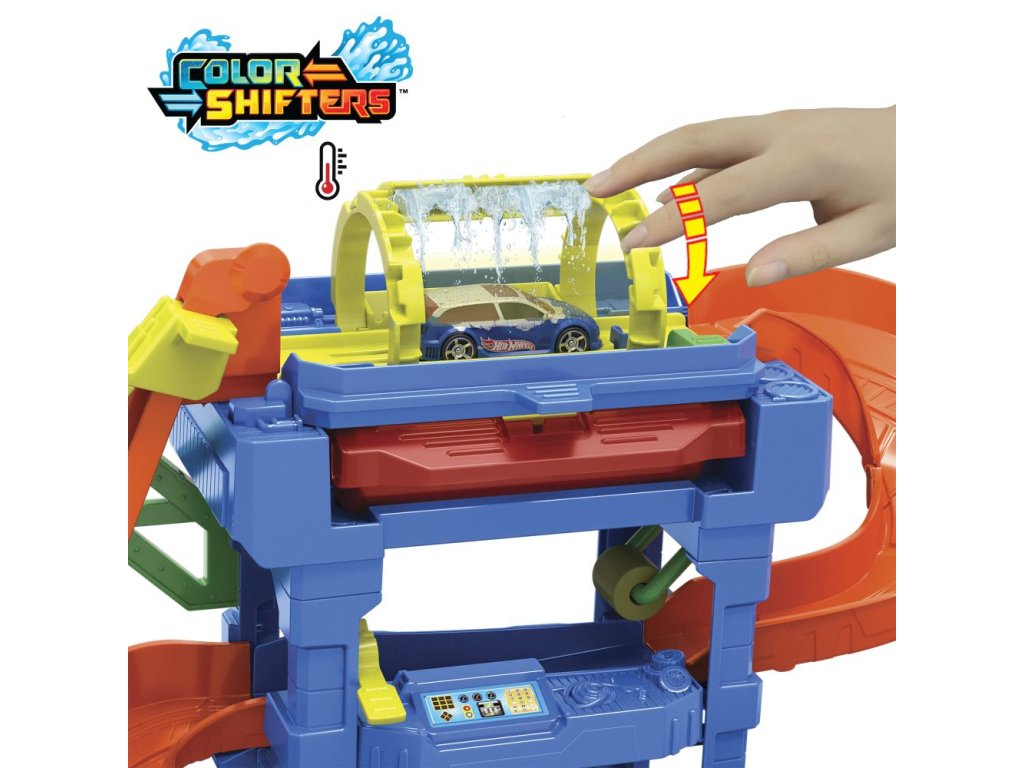 Automyčka Hot Wheels s otočným tunelem dodává akci měnících se barev s inovativním tunelem stříkajícím vodu! Děti dojedou s autíčkem Hot Wheels Color Shifter ke vchodu, odkud vyjedou výtahem ovládaným dětmi do horního patra. Vjeďte do otáčejícího se umývacího tunelu, kde se auto polije velmi teplou vodou, a uvidíte, jak se jeho dekorace okamžitě změní! Sjeďte po rampě dolů přes pěnový válec a vyjeďte do vysavače, abyste dokončili úpravu detailů. Nakonec vjeďte do stanice s ledovou vodou, kde se změní dekorace vozu do původních barev. Opakujte znovu a znovu. Barvy a provedení dekorací se mohou lišit.