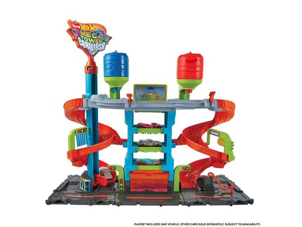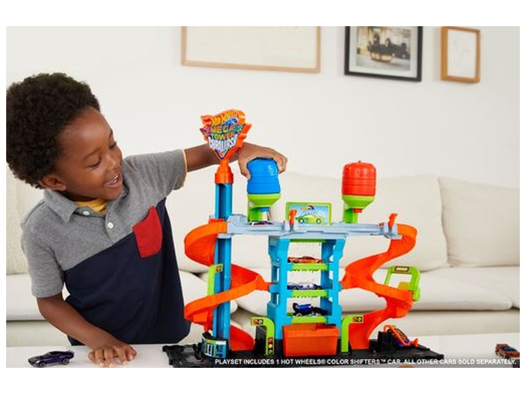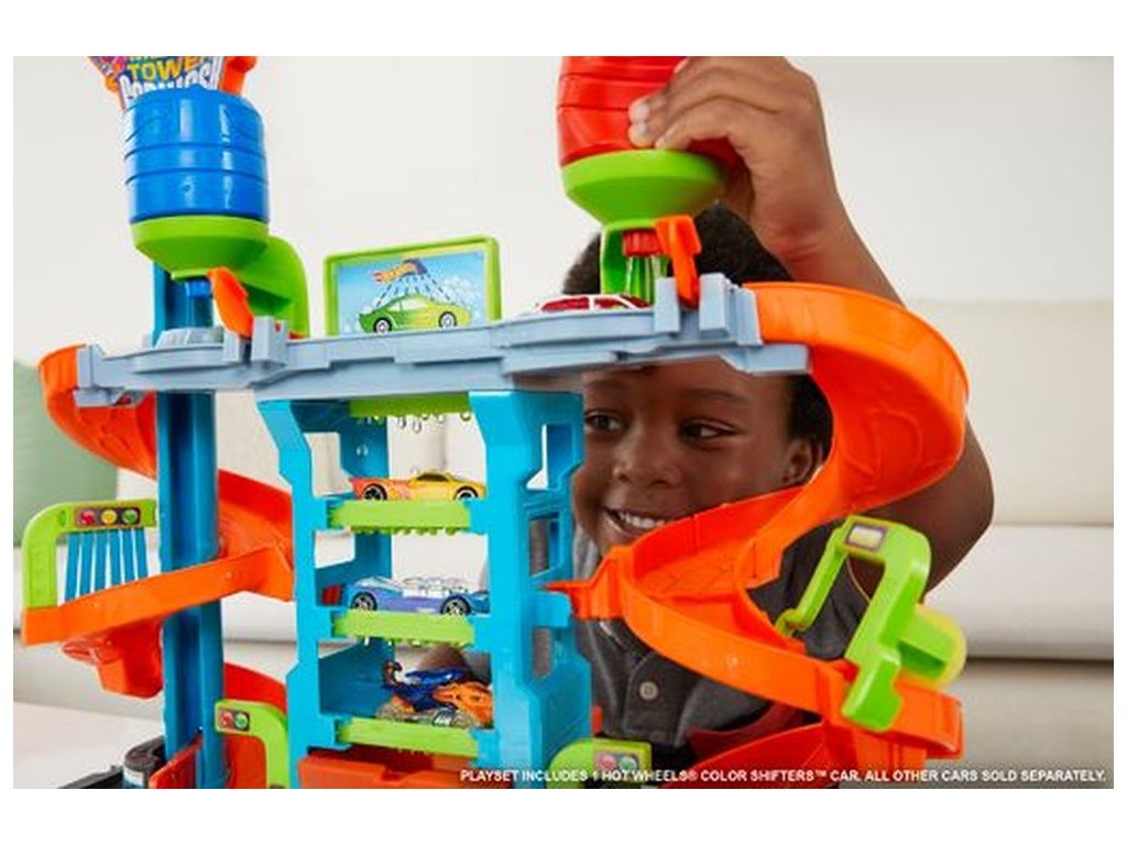 Užij si pořádnou zábavu s Hot Wheels™ City Color Shifters Automyčkou se spirálou! Zajeď do myčky a otáčej klikou, aby se auto posunulo po otočné spirále. V horní části myčky jsou dvě vodní nádrže, které rozstřikují teplou a ledovou vodu na autíčko Color Shifters™ (součástí balení), aby magicky změnily jeho barvu. Prakticky umístěné misky na vodu zachycují kapky, aby nikde nezbyl nepořádek. Barvy a dekorace se mohou lišit.