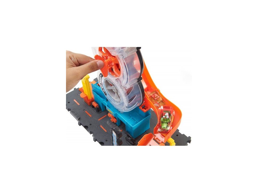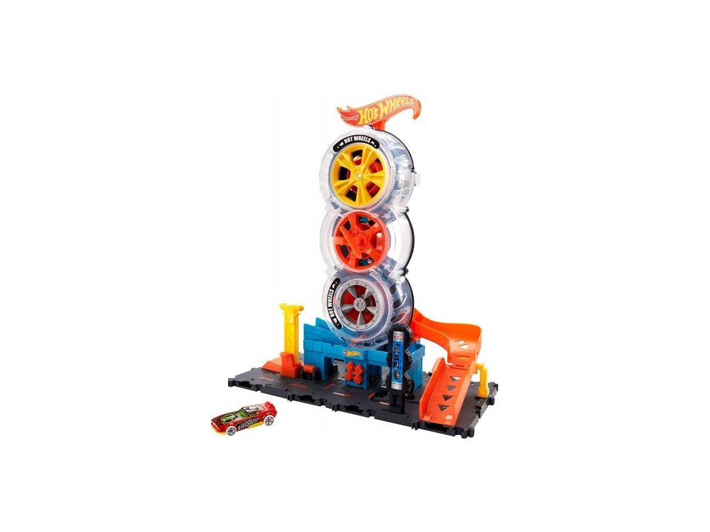 V setu Hot Wheels® City Superpneu obchod děti roztočí poutač městského pneuservisu Hot Wheels™ a sledují, jak jejich auta projíždějí hromadou pneumatik, pak se spustí dolů po rampě a vyrazí za novými dobrodružstvími. Set obsahuje jedno auto Hot Wheels® a je možné ji připojit k dalším setům.