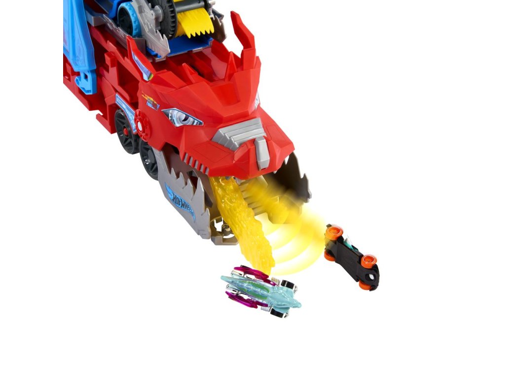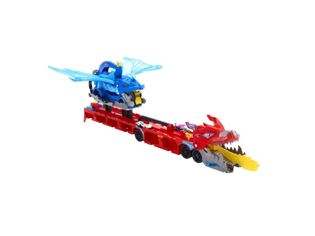 Vyražte do bitvy s tímto velkým dračím tahačem, který ukrývá ještě jednoho menšího draka – a ten požírá autíčka! Po útoku ohnivého draka můžete menšího draka odemknout a přeměnit ho na závodní dráhu. Stačí stisknout tlačítko a jeho křídla se rozhýbou jako u opravdového draka – pak už jen přilétnout a „sníst“ pár angličáků. Zpátky na základnu, vypustit autíčka do odpalovačů a pustit je do závodu po dvou paralelních drahách! Součástí balení jsou dva angličáky v měřítku 1:64, ale oba draci zvládnou pojmout více než 20 autíček (prodávají se samostatně). Můžete je vyslat do závodu nebo připojit oranžovou dráhu Hot Wheels pro ještě víc akce na dráze. Barvy a vzhled výrobku se mohou lišit.