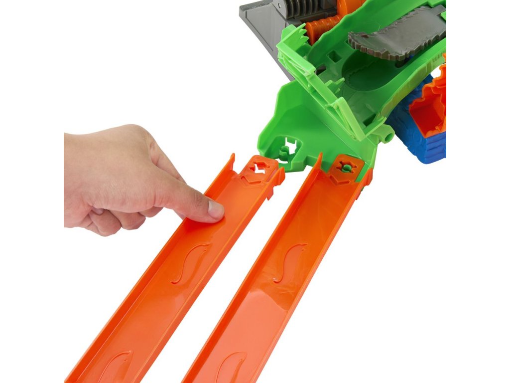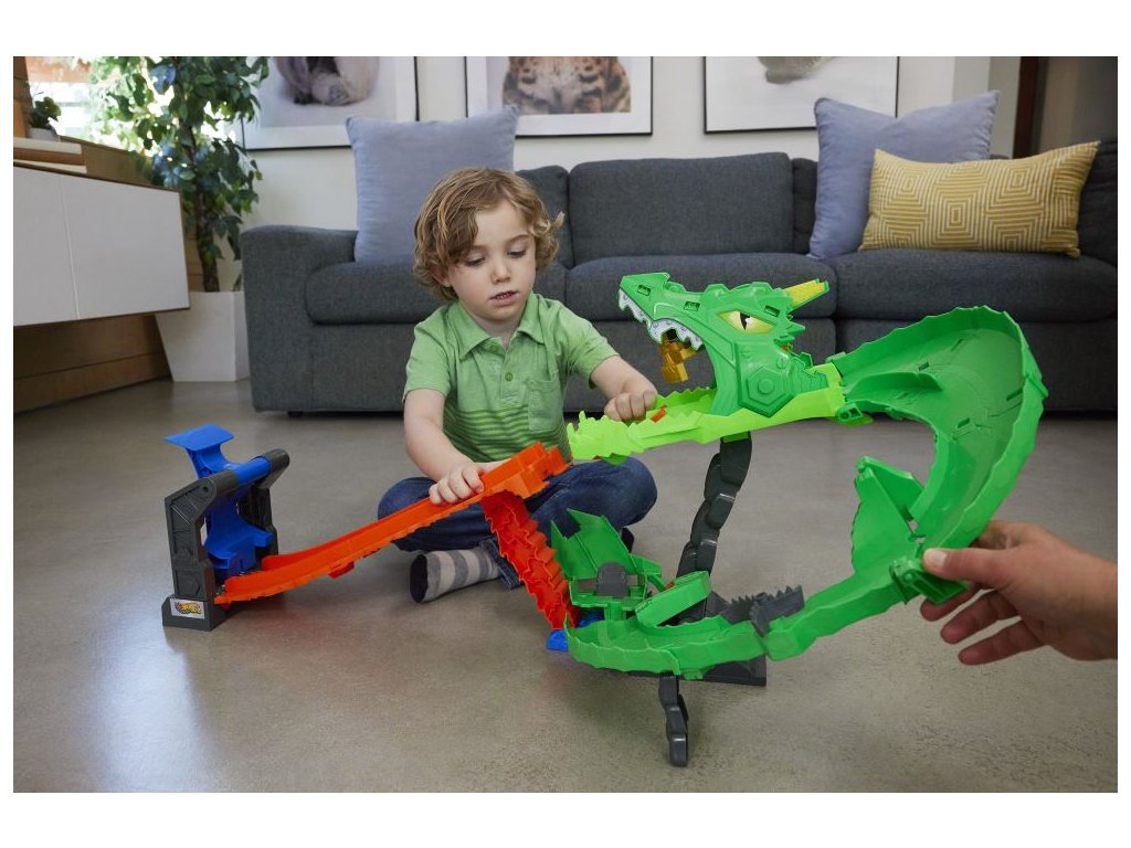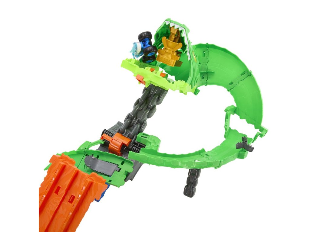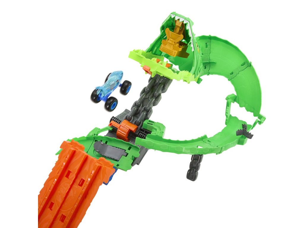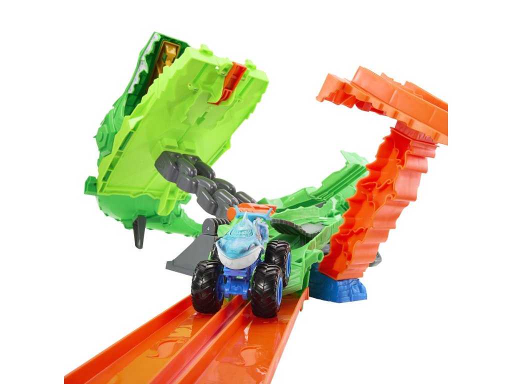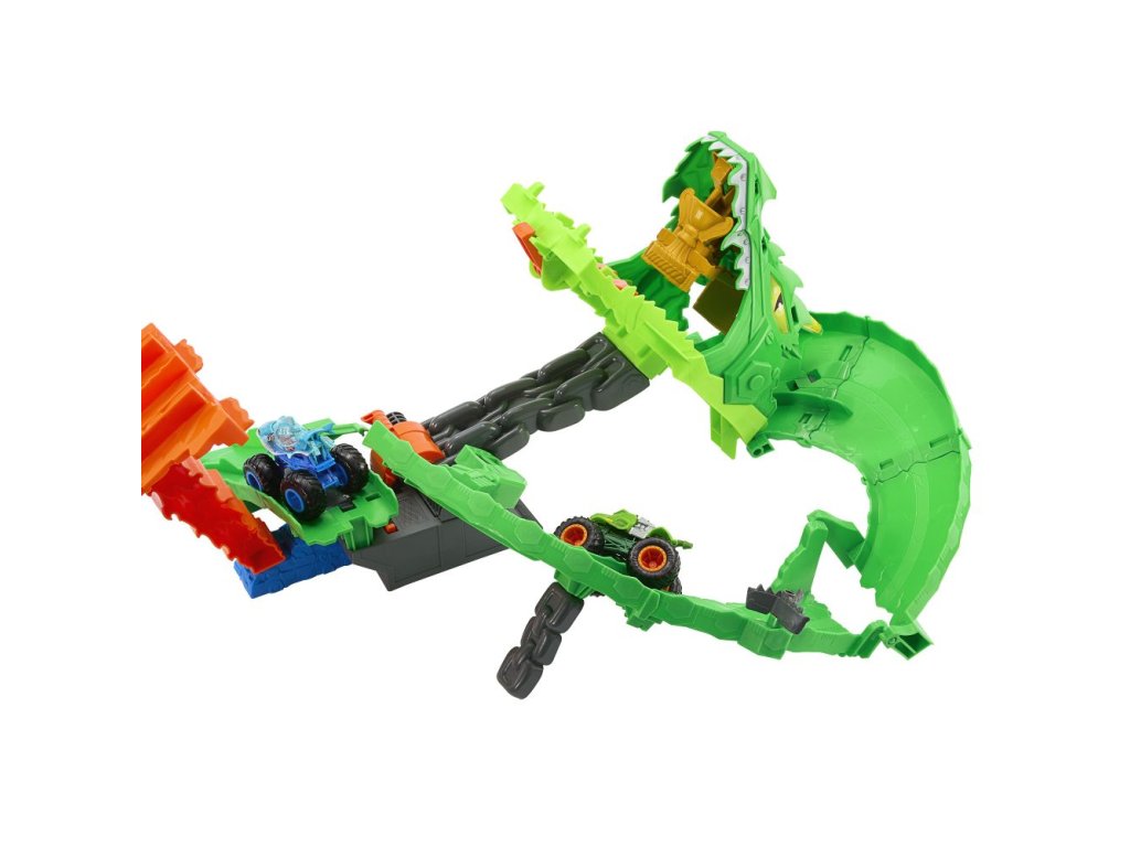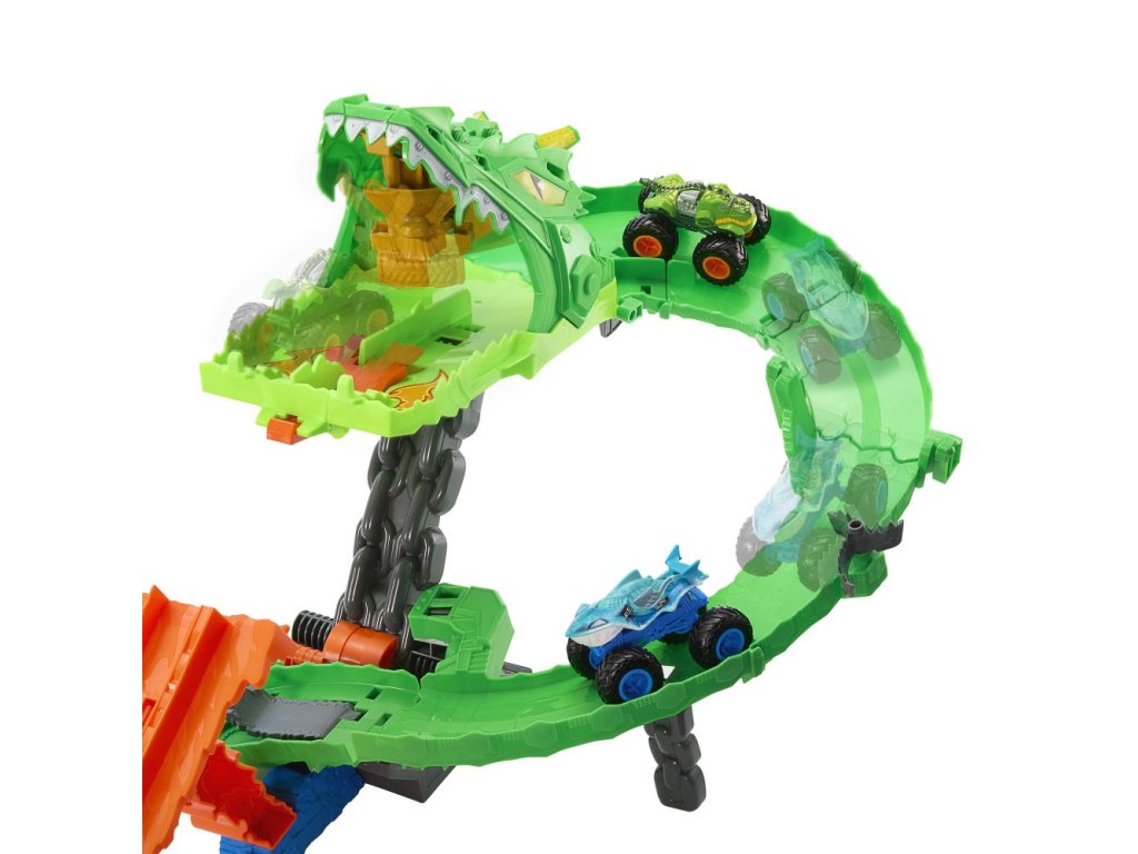 Závod začíná! Hot Wheels Monster Truck se utkávají v epickém souboji žraloci versus dinosauři, aby porazili svého úhlavního nepřítele – kybernetického draka v herním setu Dračí zkáza. Naložte oba přiložené monster trucky do dvojitého odpalovače a vystřelte je současně přímo do dračí tlamy. Čeká je divoká jízda skrz jeho tělo, kde rozhoduje motorová pila jako přeřazovač, který náhodně určí jeden ze tří výsledků – zadrží oba monster trucky, shodí jednoho z trati nebo propustí oba k vítězství. Jakmile drak padne, děti můžou znovu odstartovat útok a získat trofej! Součástí jsou dva monster trucky Hot Wheels v měřítku 1:64. Barvy a vzhled výrobku se mohou lišit.