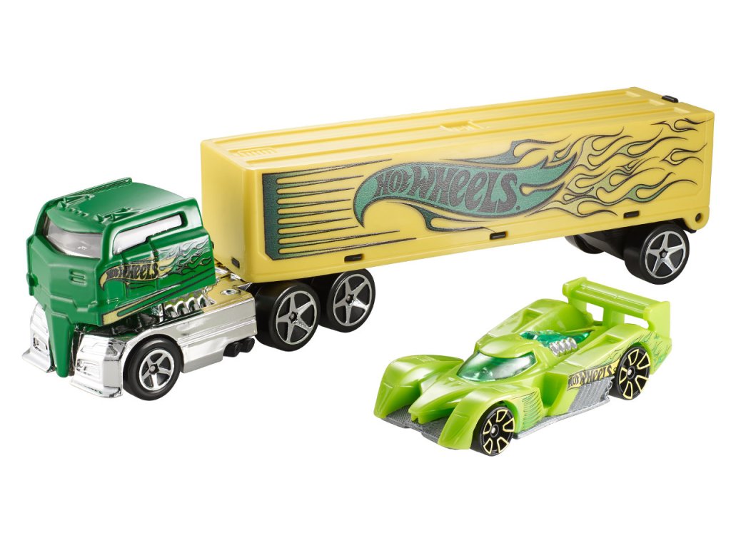 Tyto parádní náklaďáky Hot Wheels nabízejí inspirativní způsoby hry – dají se posouvat kolem, naložit a vypravit na cestu nebo postavit na závodní dráhu! Každá souprava se dodává se sportovním autíčkem a nabízí spoustu akční zábavy a dynamické detaily. Podívej na černý náklaďák s červeným okrajem, parádními „chromovanými“ trubkami a odhaleným motorem, který se dodává se suprovým modrým závoďákem! Nebo si vyber zelený náklaďák s ocelově stříbrnou lebkou, s obložením se zelenými plameny a obrovskou lebkou s hnáty, které drží retro světlomety! Kolekce nabízí spoustu modelů náklaďáků, které udělají radost každému, kdo miluje nová dobrodružství na rychlých kolech.