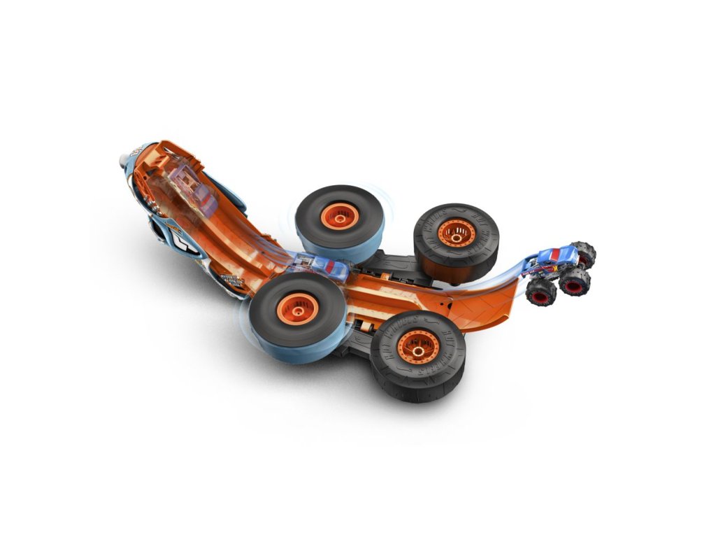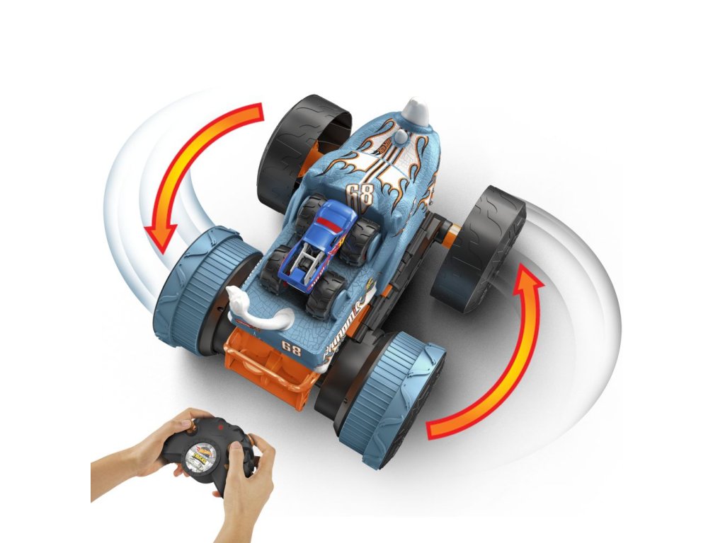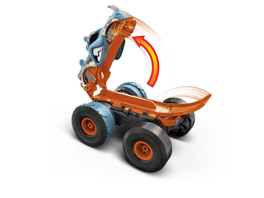 Bourejte, rozbíjejte a uhánějte šílenou rychlostí s autem Hot Wheels® RC Monster Truck Transformující se Rhinomite! Tento Monster Truck na dálkové ovládání v měřítku 1:12 je vybaven masivními pneumatikami, autentickými dekory a režimem Dynamite - velký Monster Truck se transformuje na motorový zrychlovač pro menší Monster Trucky v měřítku 1:64. Dokáže je vystřelit až do výšky 91 cm! Součástí balení je jeden model Race Ace™ v měřítku 1:64 - během RC hry ho uložte do lože většího kamionu a po velké proměně ho vypusťte pomocí zrychlovače. Předvádějte parádní triky a užijte si jízdu o rychlosti až 9 km za hodinu. Barvy a provedení se mohou lišit.