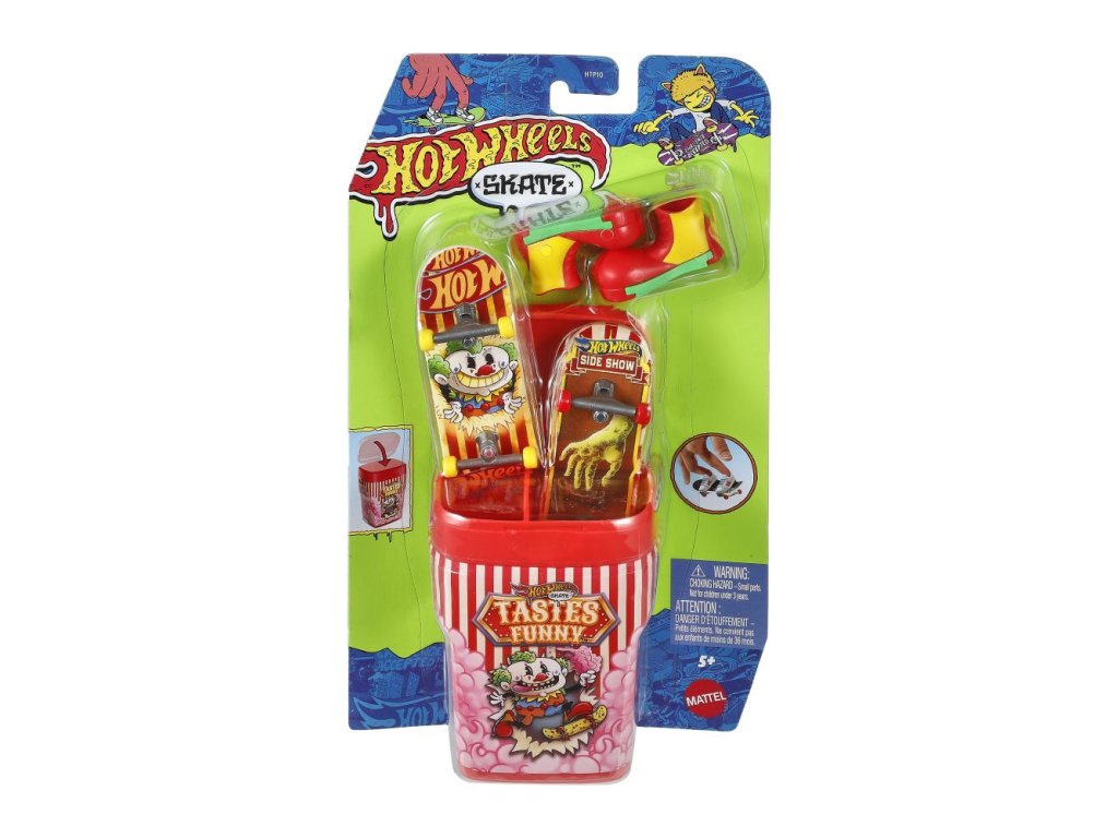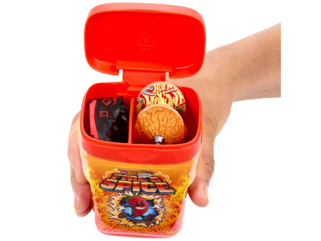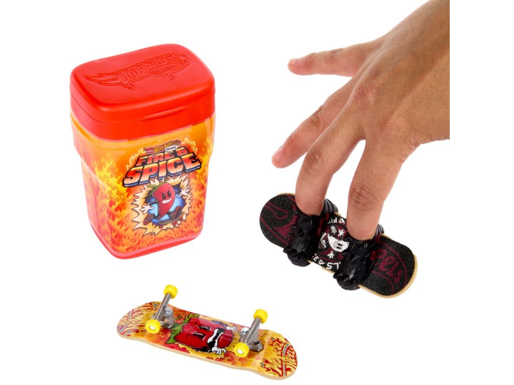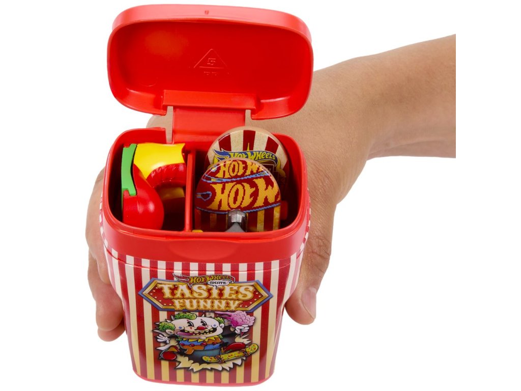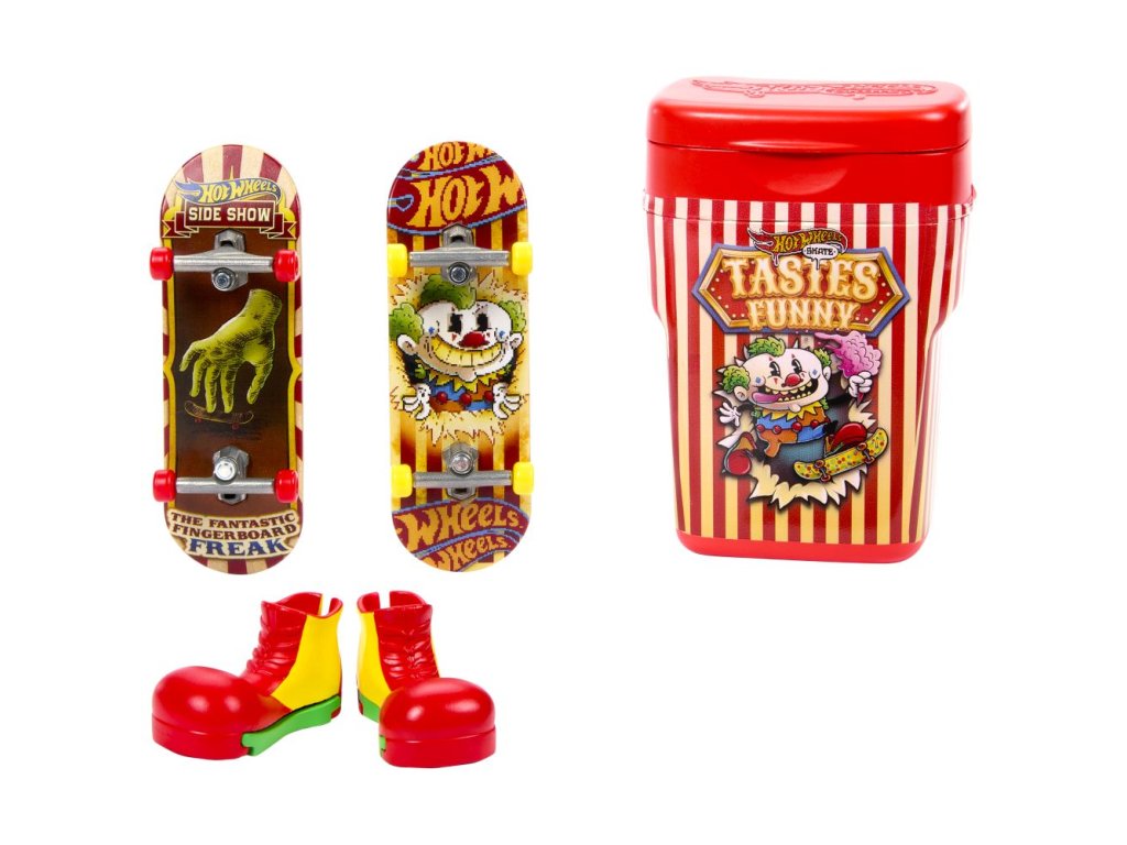 Vezměte si prkna na cesty s krabičkou Hot Wheels®, která pojme a ukryje 2 plně sestavené fingerboardy a pár skate a která připomíná balení žvýkaček! Otevřete "příchuť" jako "Bubble Blast" nebo "Snakeberry Sour", každá krabička je zdobená stylovou grafikou. Uvnitř jsou 2 exkluzivní prkna a pár odnímatelných skate bot s odpovídající kresbou a barvami. Každé balení se prodává samostatně dle aktuální nabídky.
