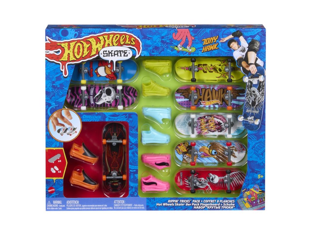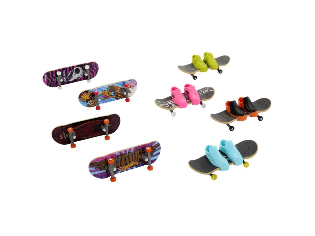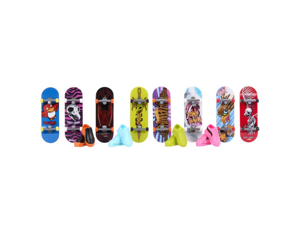 Předvádějte drsné skoky s tímto setem 8 ks fingerboardů a skate bot. Hot Wheels® a legenda skateboardingu Tony Hawk se spojili, aby vytvořili epickou kolekci fingerboardů, které vypadají skvěle při broušení railů a provádění ollies. Set obsahuje osm různých, úžasně stylizovaných a kompletně sestavených fingerboardů spolu se čtyřmi různými páry skate bot, které lze střídavě používat se všemi fingerboardy. Skate boty pomáhají dětem získat cit při zvládání kaskadérských kousků a salt. Barvy a vzhled výrobku se mohou lišit.