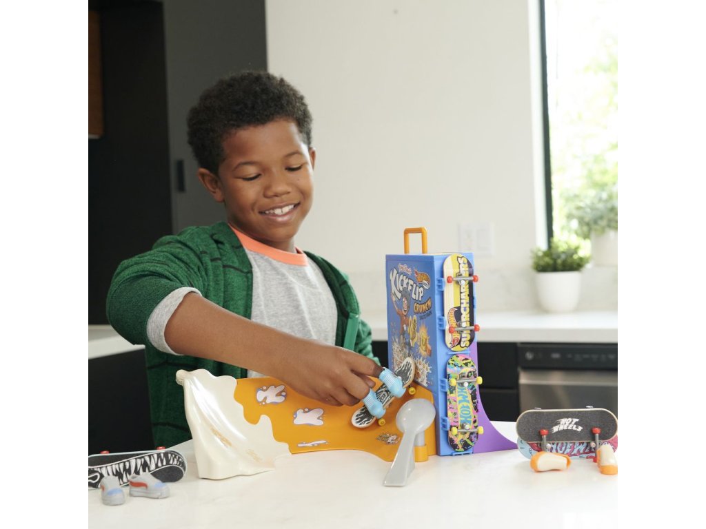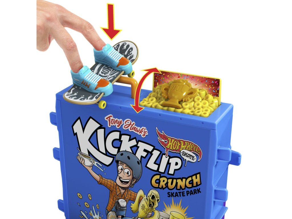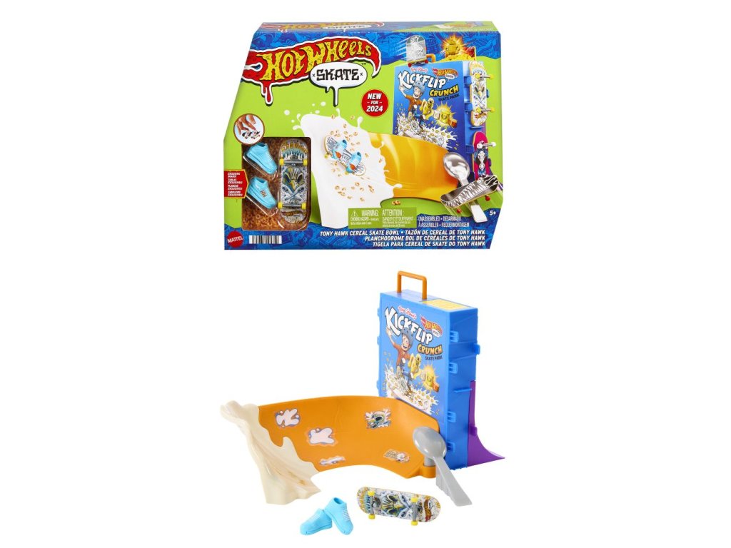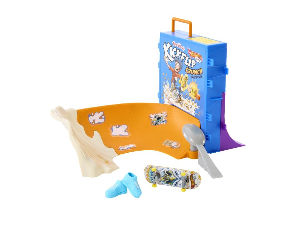 S herním setem Hot Wheels® Cereáliový fingerboard skatepark se můžete prohánět po velkolepé misce s cereáliemi. Tento skate set s motivem cereálií, vytvořený ve spolupráci s legendou skateboardingu Tony Hawkem, vyzývá fingerboardisty, aby projeli miskou s cereáliemi, předváděli vertikální triky na krabici s cereáliemi a nahoře zabrousili na zábradlí, aby mohli odhalit překvapivou trofej. Projeďte se po zadní rampě a zabruste na rail na lžíci, abyste měli větší šmrnc! Součástí je jeden exkluzivní fingerboard a odnímatelný pár skate bot s úložným prostorem pro čtyři prkna a čtyři páry bot. (Další prkna a boty se prodávají samostatně.) Barvy a provedení se mohou lišit.