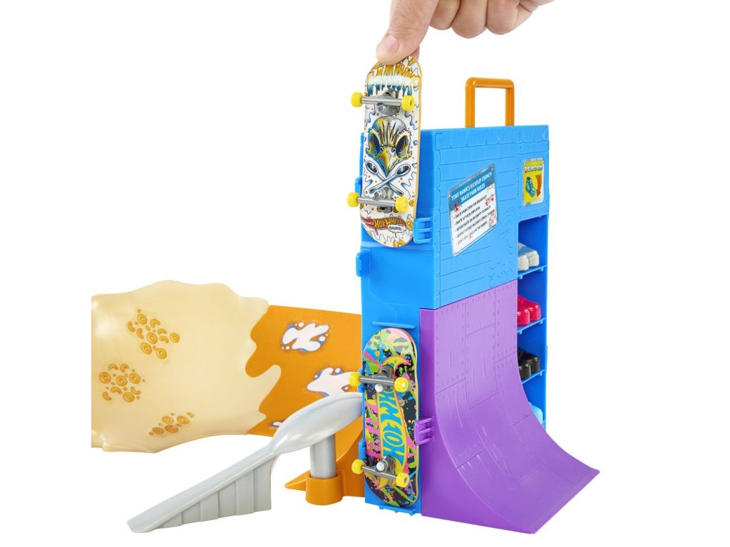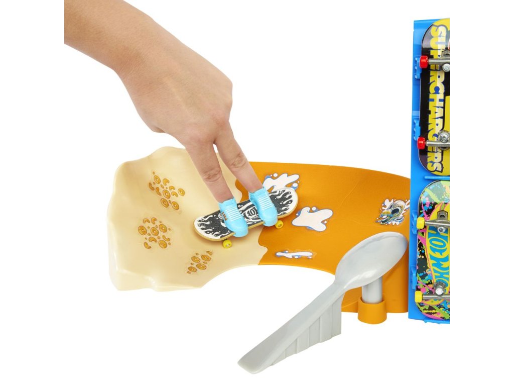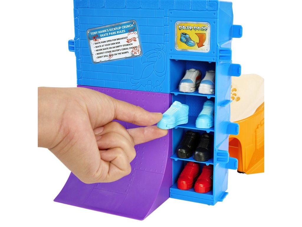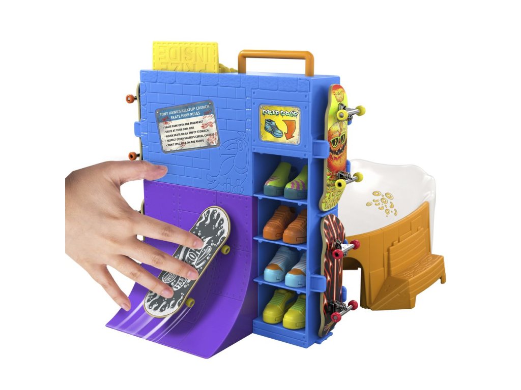 S herním setem Hot Wheels® Cereáliový fingerboard skatepark se můžete prohánět po velkolepé misce s cereáliemi. Tento skate set s motivem cereálií, vytvořený ve spolupráci s legendou skateboardingu Tony Hawkem, vyzývá fingerboardisty, aby projeli miskou s cereáliemi, předváděli vertikální triky na krabici s cereáliemi a nahoře zabrousili na zábradlí, aby mohli odhalit překvapivou trofej. Projeďte se po zadní rampě a zabruste na rail na lžíci, abyste měli větší šmrnc! Součástí je jeden exkluzivní fingerboard a odnímatelný pár skate bot s úložným prostorem pro čtyři prkna a čtyři páry bot. (Další prkna a boty se prodávají samostatně.) Barvy a provedení se mohou lišit.