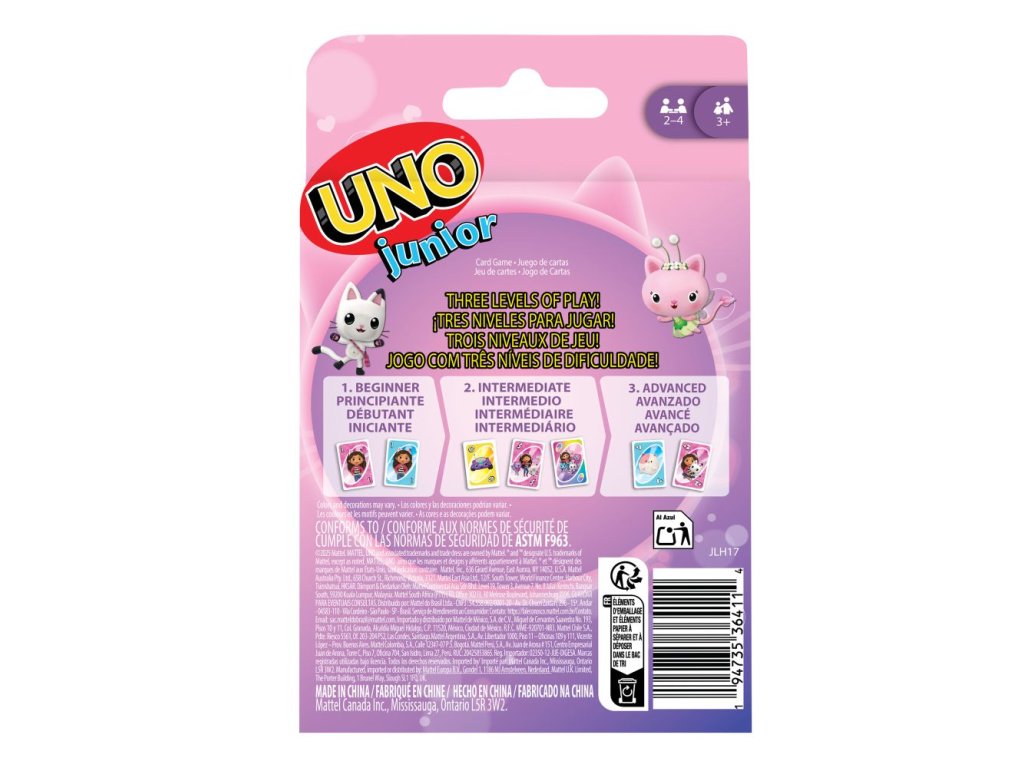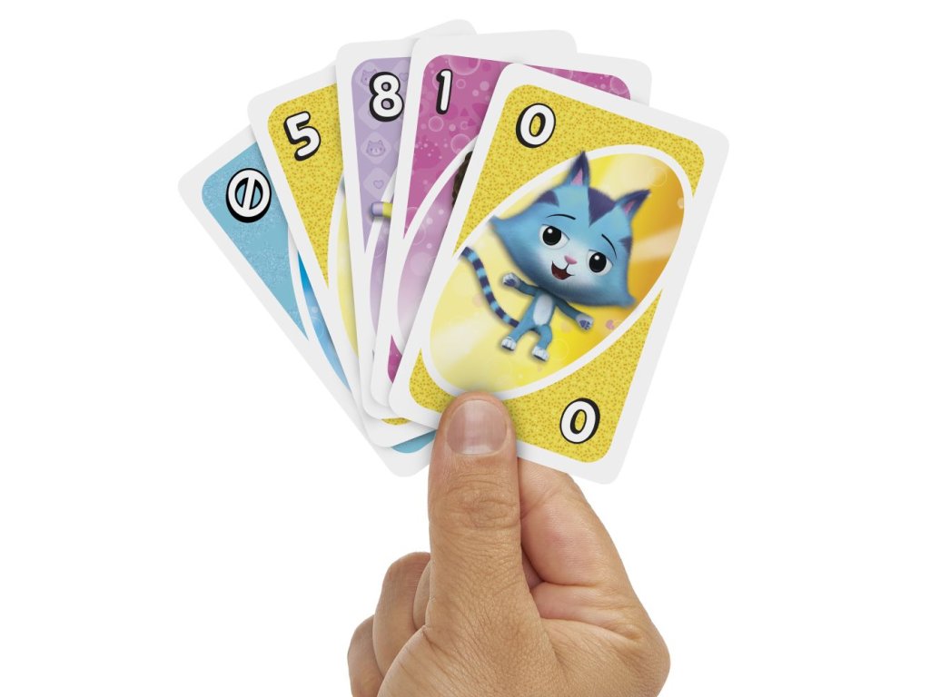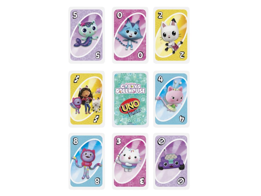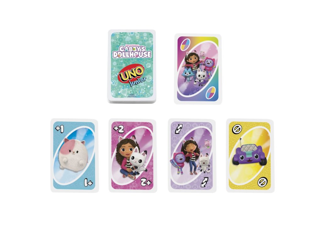 Kočičí verze oblíbené karetní hry UNO Junior s motivy postaviček z animovaného seriálu Gabby’s Dollhouse od DreamWorks přináší spoustu zábavy pro malé hráče. Hraje se podle klasických pravidel – hráči se snaží zbavit všech karet postupným přikládáním podle barvy nebo čísla. Tato edice obsahuje tři úrovně obtížnosti – začátečník, střední a pokročilý – které se přizpůsobí dovednostem dítěte. Když zbývá poslední karta, nesmí chybět výkřik „UNO!“. Speciální grafické symboly na každé kartě navíc pomáhají rozlišit barvy, takže si hru mohou užít i hráči s jakoukoli formou barvosleposti. Barvy a vzhled karet se mohou lišit.