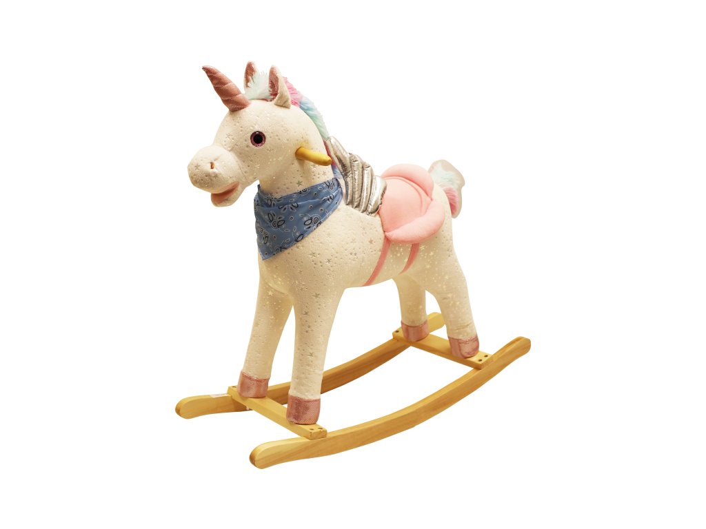 Jednorožec houpací s efekty duhový. Rozměry 74 x 33 x 65 cm. Vydává zvukové efekty, hýbe tlamou a ocasem. Aktivace tlačítkem v uchu. Přihrádka na baterie se nachází na břiše jednorožce. 3xAA baterie nejsou součástí.