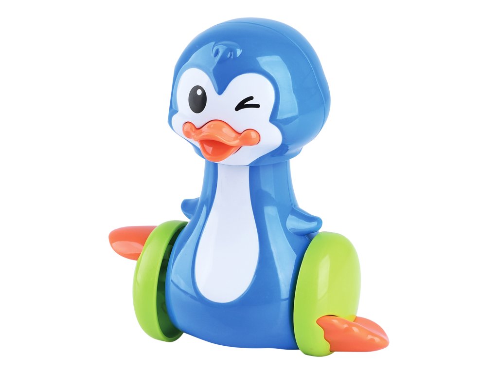 Tučňák. Velikost 13 cm. Natahovací - natažení zatlačením hlavy směrem dolů. Po uvolnění hlavy se tučňák rozjede.