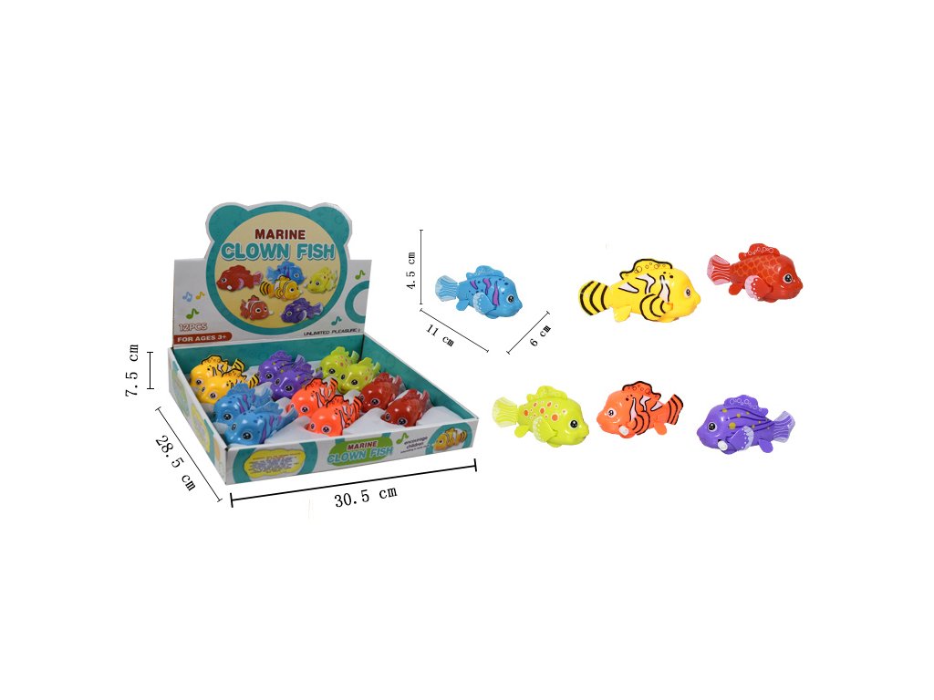 Ryba na natáhnutí. Velikost 11 cm. 12 ks display box. 6 variant - modrá, zelená, žlutá, oranžová, červená, fialová.