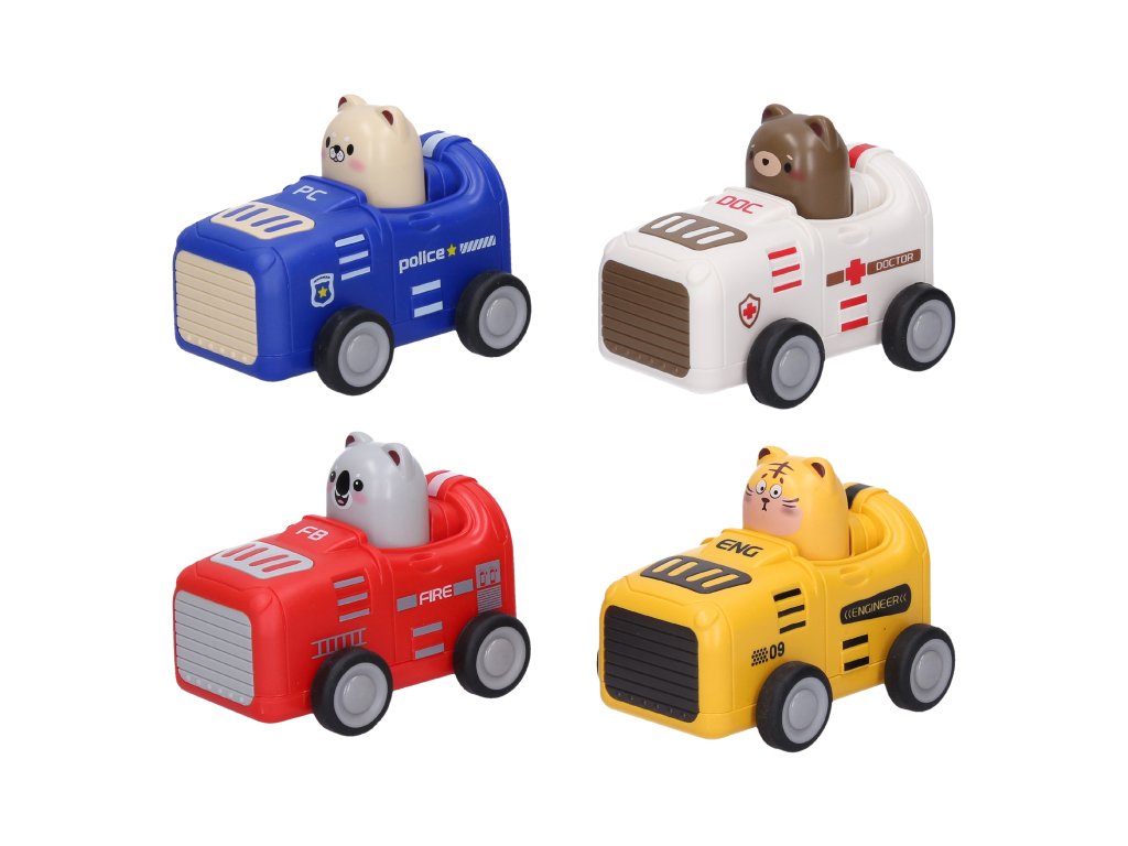Zvířátko v autíčku. Velikost 9 cm. Natahovací, pohyb zatlačením zvířátka dolů. 12 ks display box. 4 varianty - červená, modrá, bílá, růžová.
