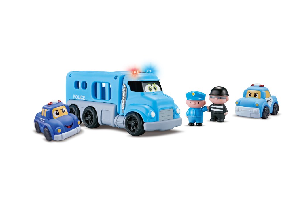Auto policejní set 4ks. velikost auta 26cm. Obsahuje velké auto, 2malé auta 7cm, 2 panáčky. Světelné a zvukové efekty. Setrvačník. Baterie 3xAG13 součástí.