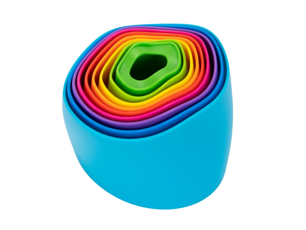 Fat Brain Spirálové stohovací kelímky Spiroku. Spiroku se skládá z 9 dílů. Když jsou všechny díly vložené do sebe, je možné je vytáhnout až do výšky 55 cm.