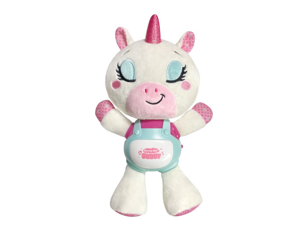 Usínáček jednorožec s efekty. Velikost 29cm. baterie 3xAAA nejsou součástí. Přepínač on/off na boku zvířátka. Stisknutím bříška se spouští zvukové efekty- 1. stisknutí ukolébavka, 2. stisknutí uklidňující hudba, 3. stisknutí chrápání, 4. stisknutí pouze světlo, 5. stitknutí vypnutí, 6. stisknutí cycle