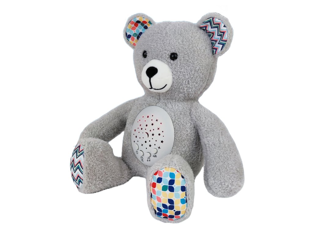 Usínáček s projekcí medvěd. Velikost 24cm. Baterie 3xAA nejsou součástí. Tlačítko ON//OFF přidržením po dobu 2s se zapne/vypne. Tlačítko světla jedním stisknutím rozsvítí projekci, další stisknutí zvyšují intenzitu svícení a 4.stisknutím se zhasne. Tlačítko s notou spouští ukolébavky. Celkem 7 písniček, které se přepínají opětovným stisknutím. Tlačítko s vlnou zapíná bílý šum. Stisknutím se spustí jeden ze tří bílých šumů, který trvá vždy 30min a poté se vypne. Další bílý šum se spustí až po stisknutí tlačítka.