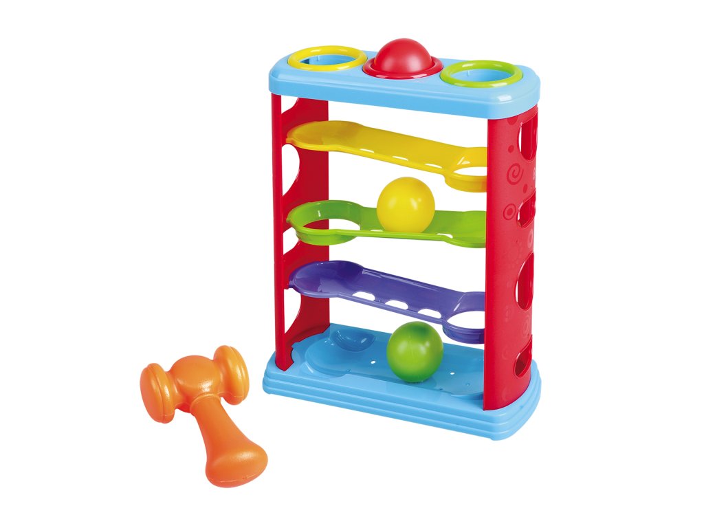 Věž s míčky a kladívkem. Obsahuje věž, kladívko a 3 míčky. Rozměry věže 24x10x27 cm.