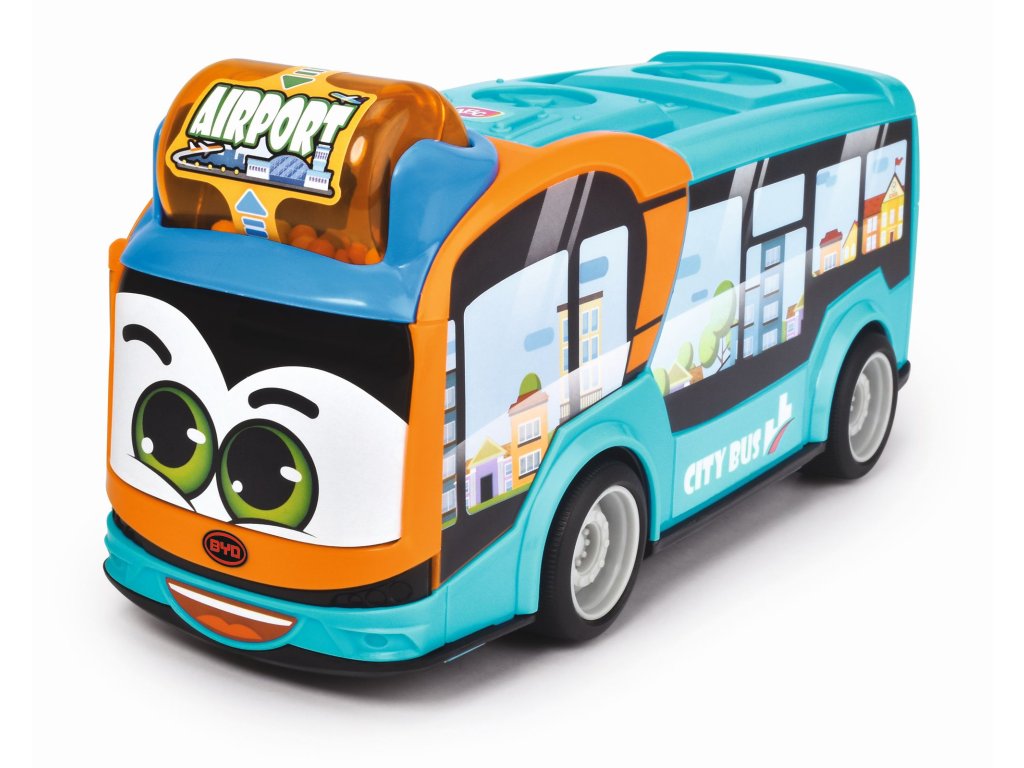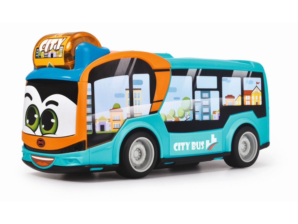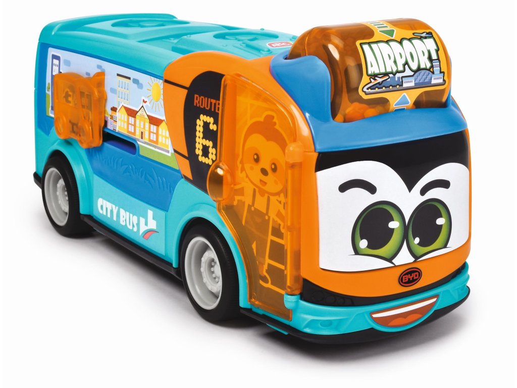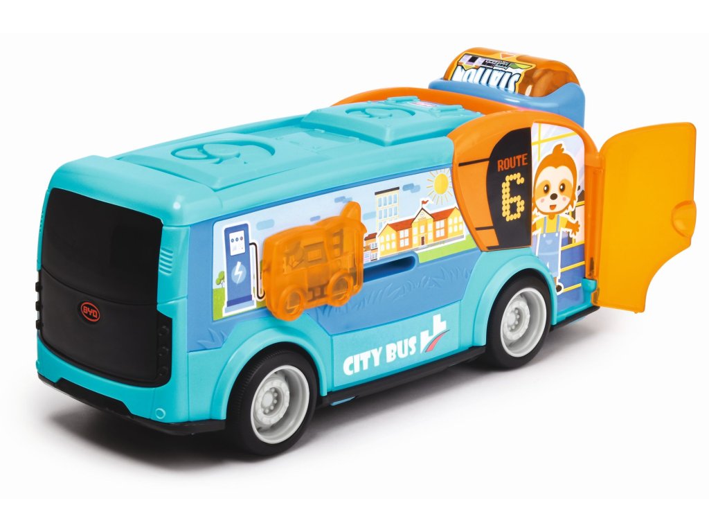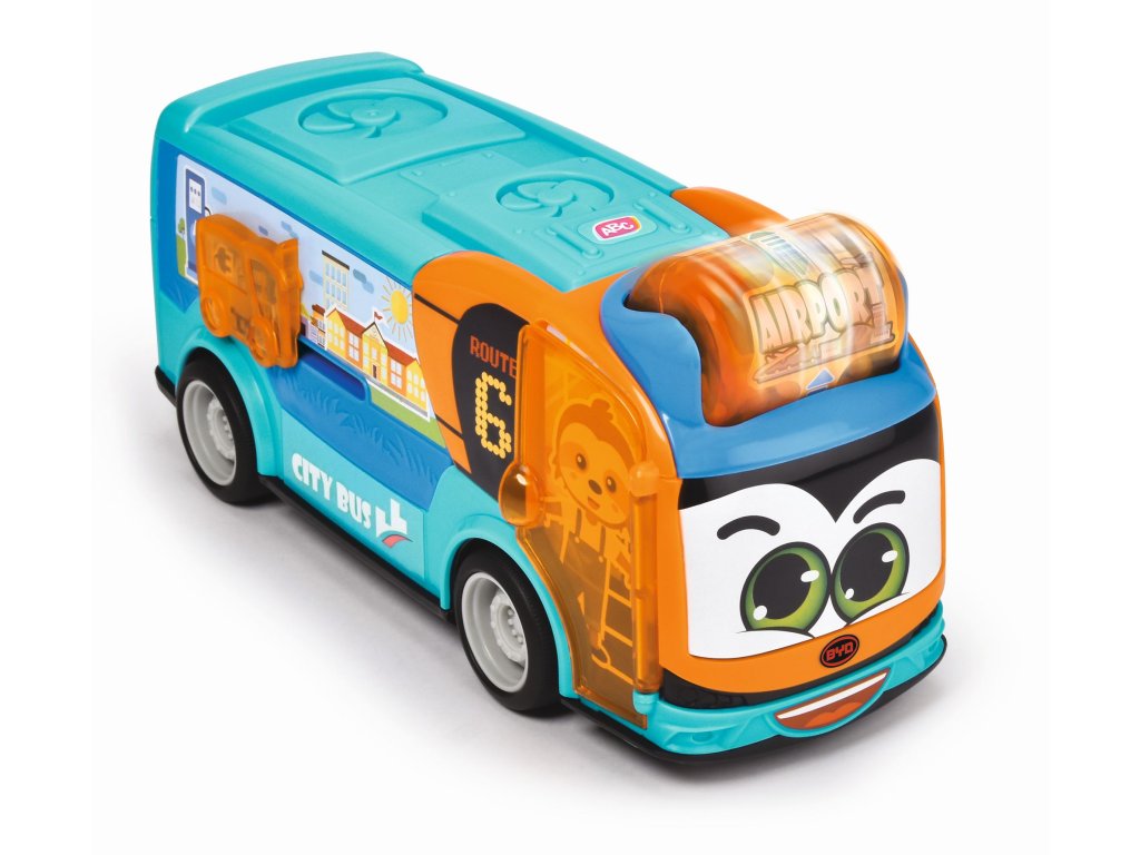 Autobus na volnoběh, s otočným chrastítkem s cílovou stanicí, s otevíracími dveřmi a bočním pohyblivým prvkem. Délka 22 cm.