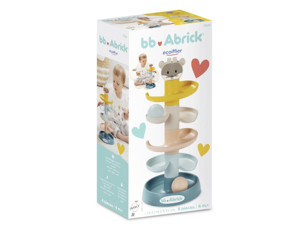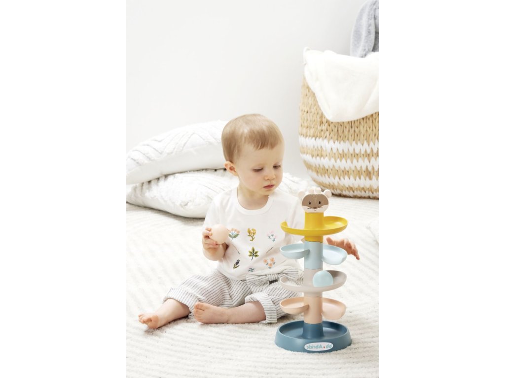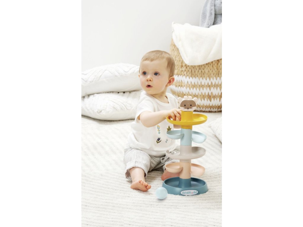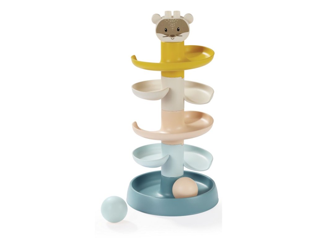 Věž k sestavení pro nejmenší v jemných barvách s míčky a hlavou medvídka na vrcholu. Trénuje motoriku a koordinaci dítěte. Rozměry věže (DxŠxV): 16,5 x 16,5 x 34 cm.