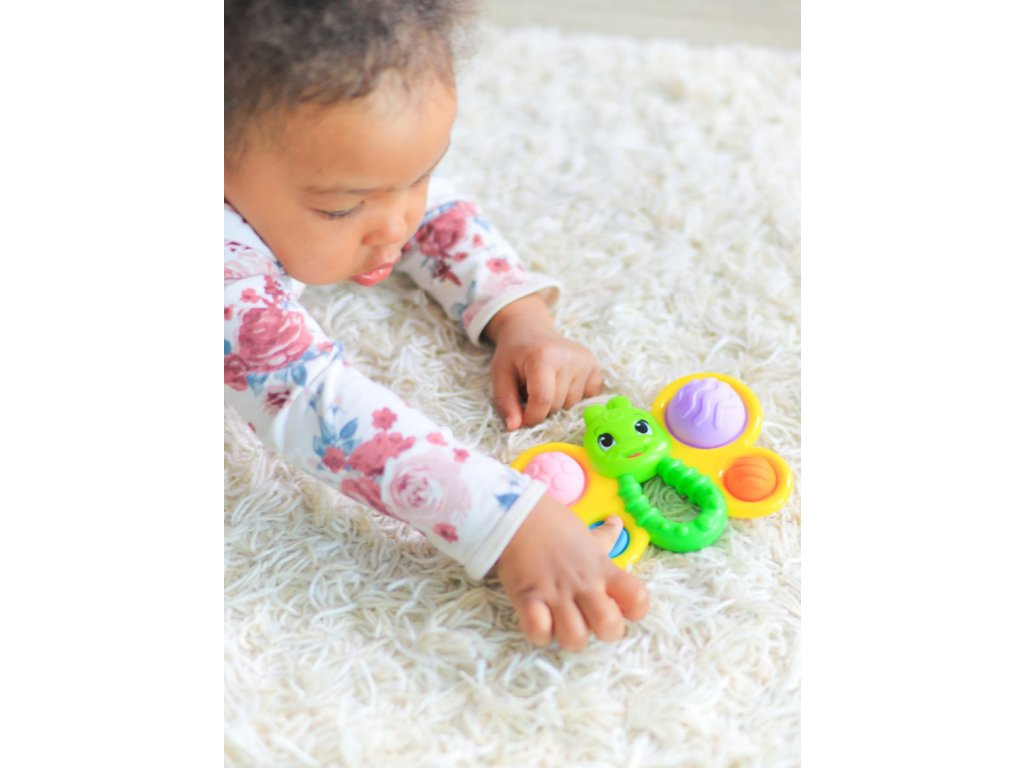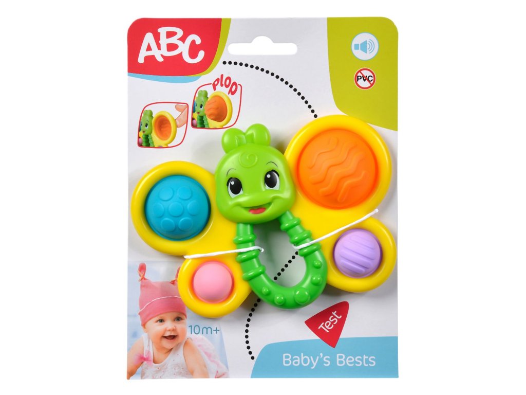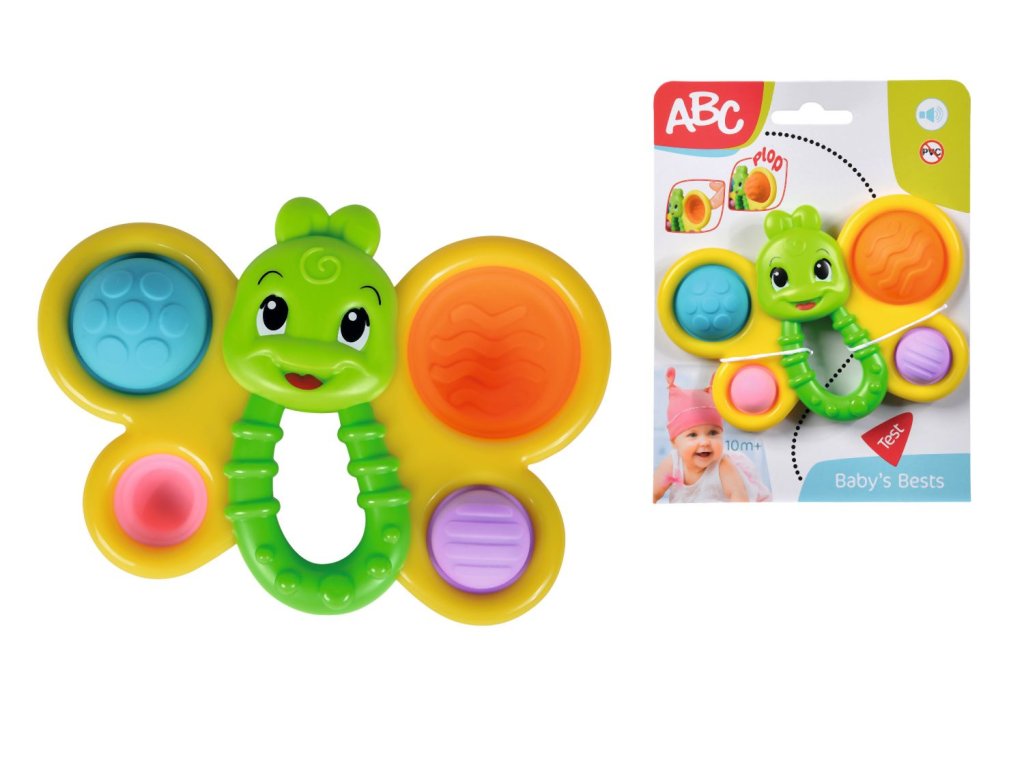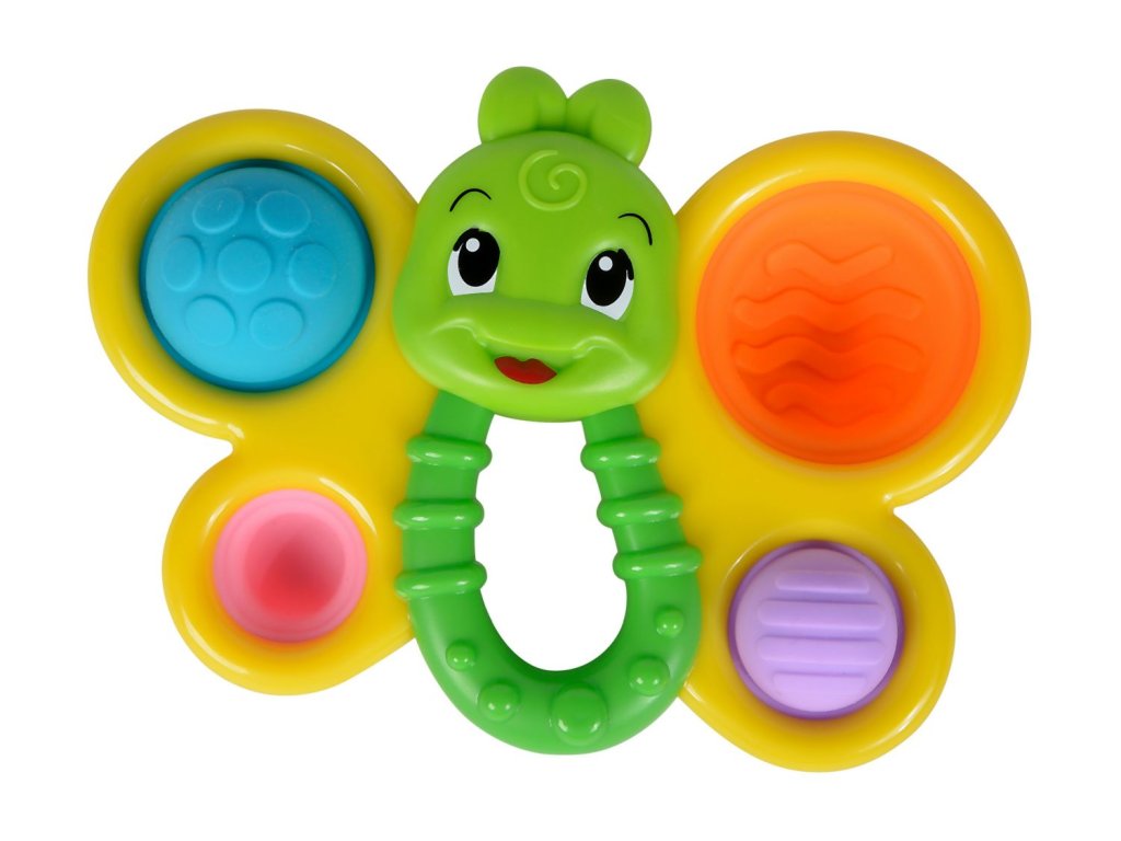 Veselý barevný motýl s rukojetí pro snadné držení a se čtyřmi různými měkkými výplněmi. Délka 14 cm.