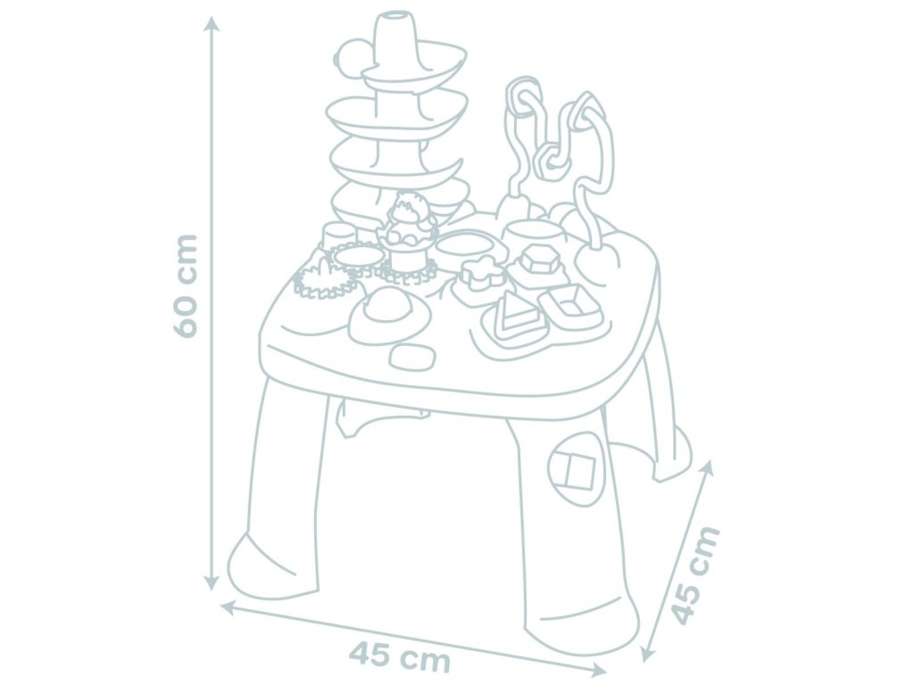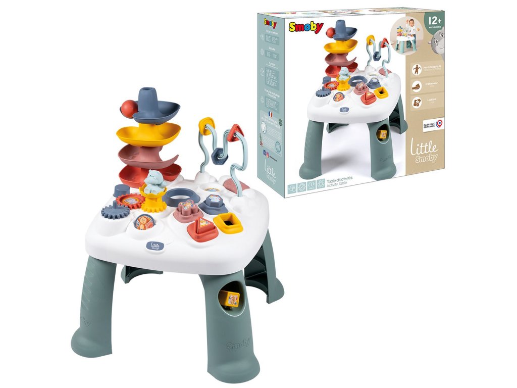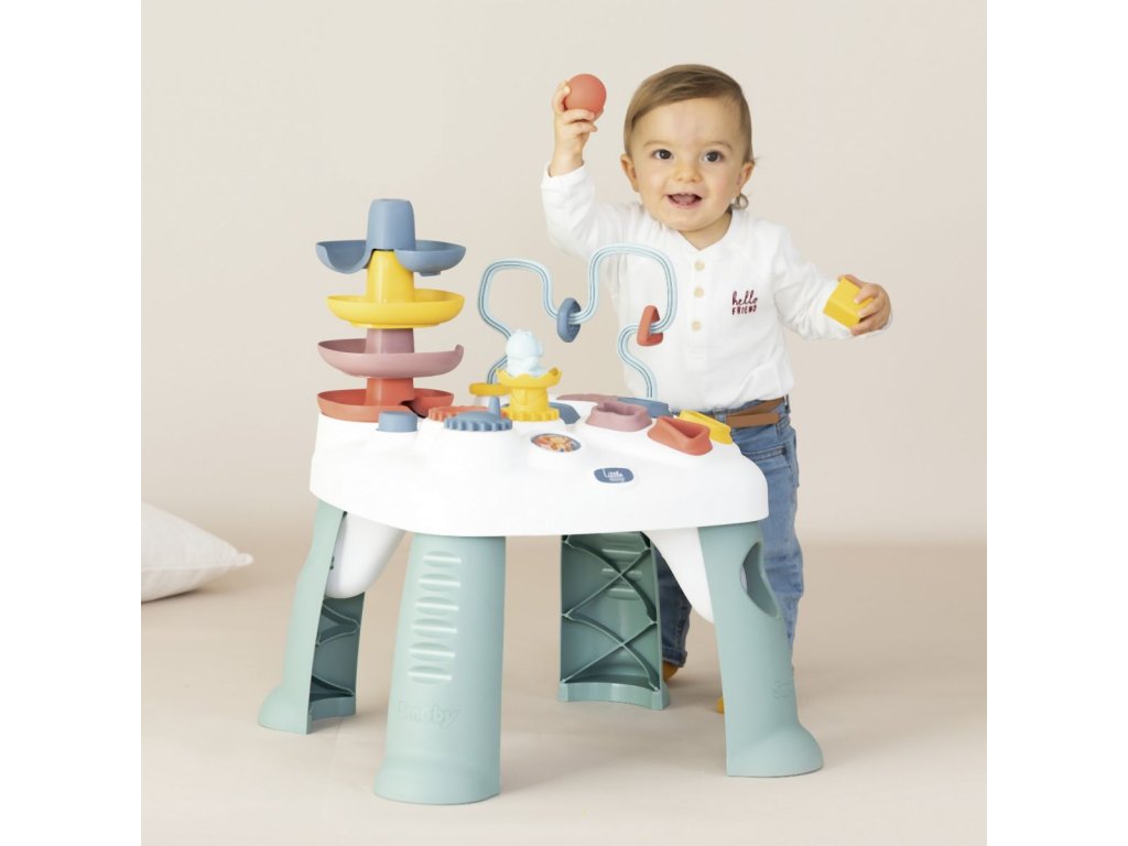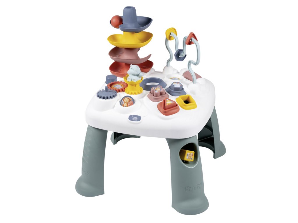 Všestranný hrací stůl Little Smoby Activity se svými četnými funkcemi slibuje vzrušující herní dobrodružství pro děti od 12 měsíců. Tato interaktivní výuková hračka zve děti k objevování a zkoumání. Mnoho barevných herních prvků přitahuje pozornost těch nejmenších a trénuje motorické a sluchové dovednosti. Ve hře na rozpoznávání tvarů se stavební kameny zasouvají do příslušných otvorů. Malá kuličková dráha s rampou vás zve ke hře a zkoušení. Rozměry produktu (DxŠxV): 45 x 45 x 60 cm.