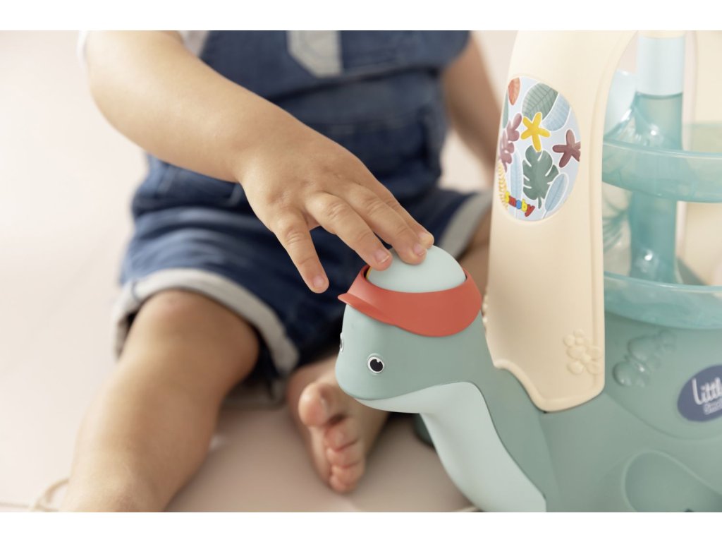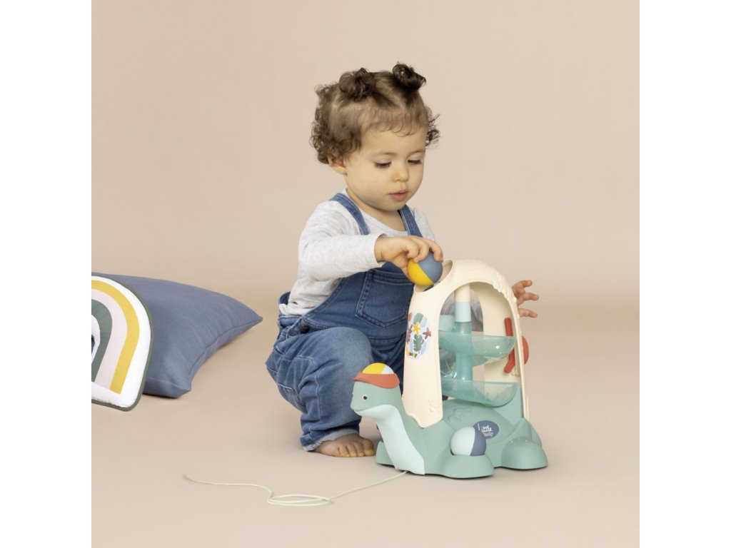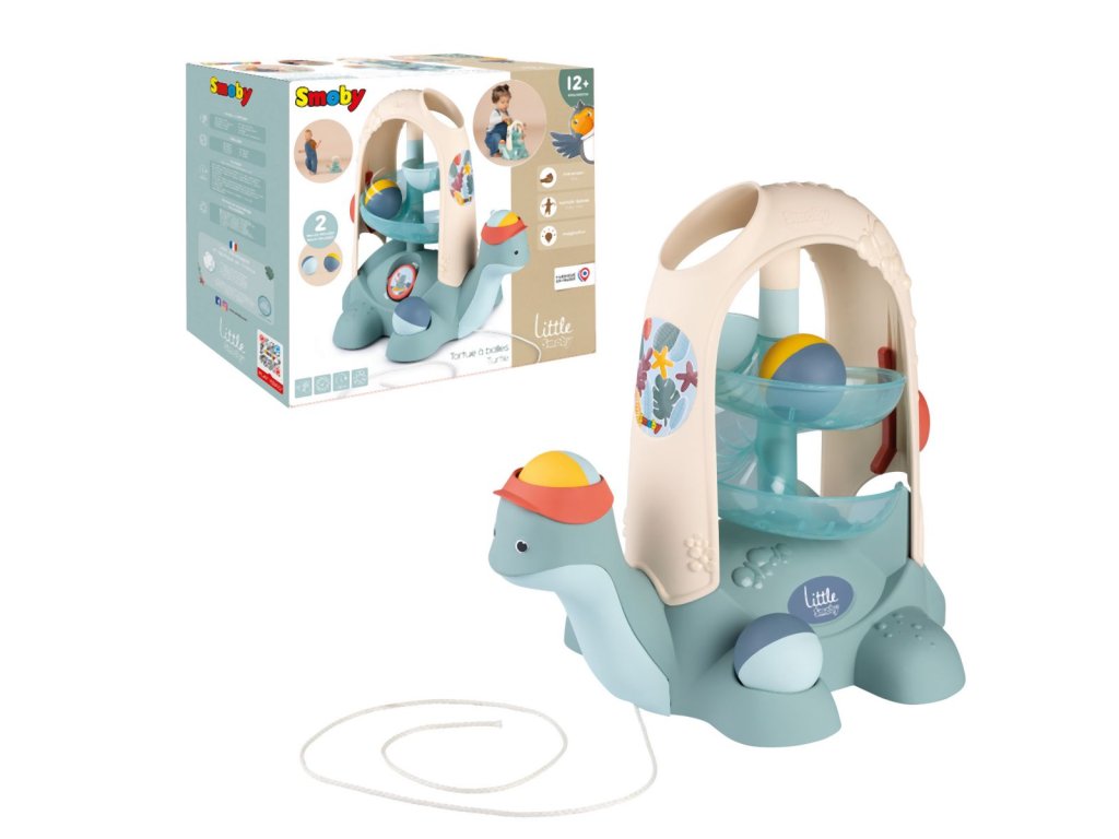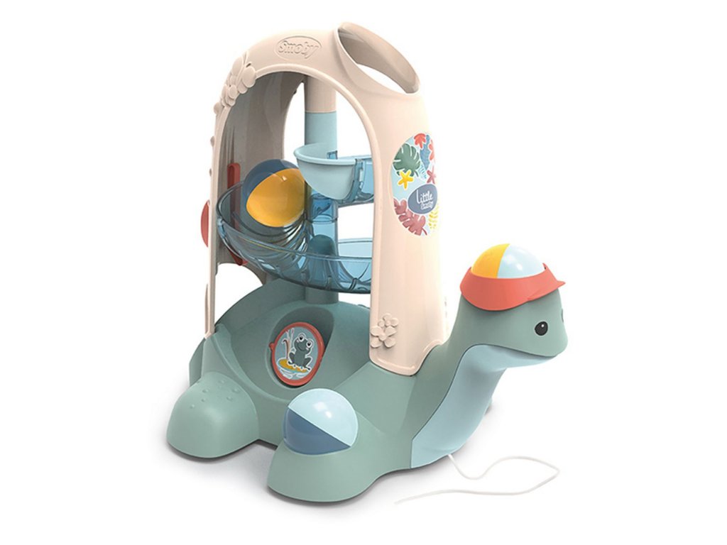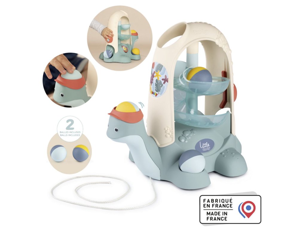 Barevná želva z řady Little Smoby je výrobek 2 v 1: okruh pro míčky a tahací hračka. Jednoduše vložte míček do horní části krunýře a ten se sroluje až na konec želvího ocasu, kde se opět vykulí. Želva je na provázku. Trénuje motoriku a koordinaci, pro děti od 12 měsíců. Balení obsahuje i dva míčky. Rozměry výrobku 28x20x29.