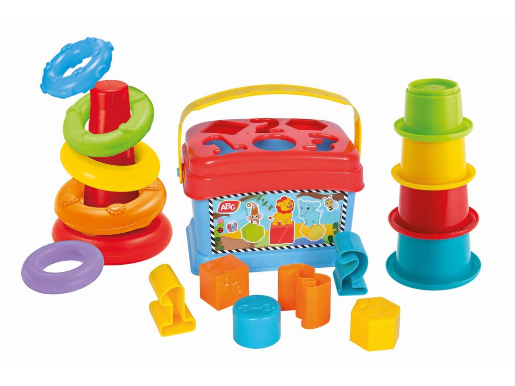 Sada pro nejmenší obsahuje vkládací box, pyramidu z kroužků a pyramidu z kelímků. Celkem 18 ks.