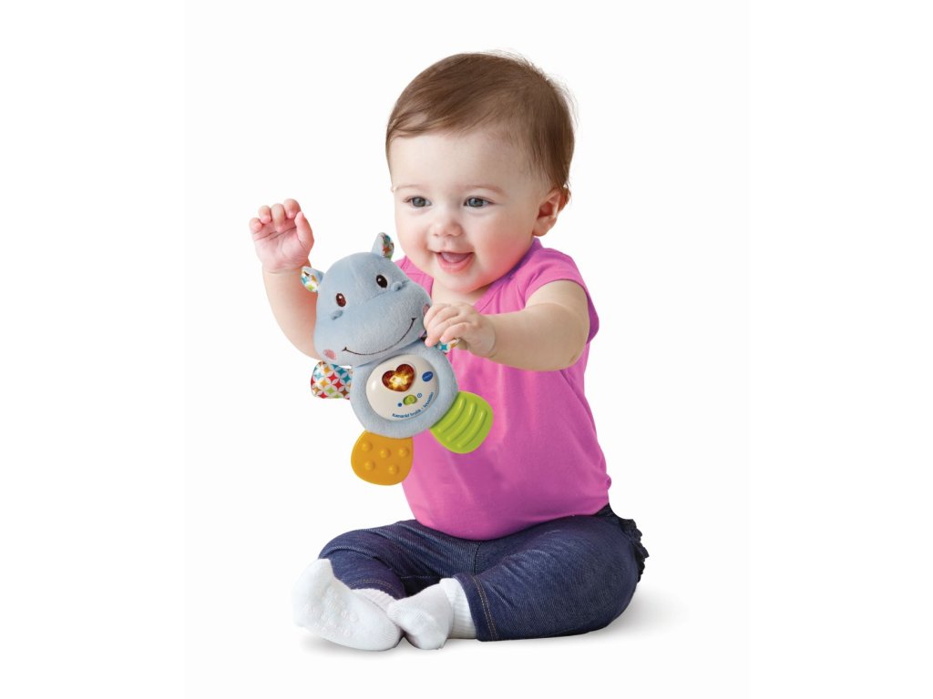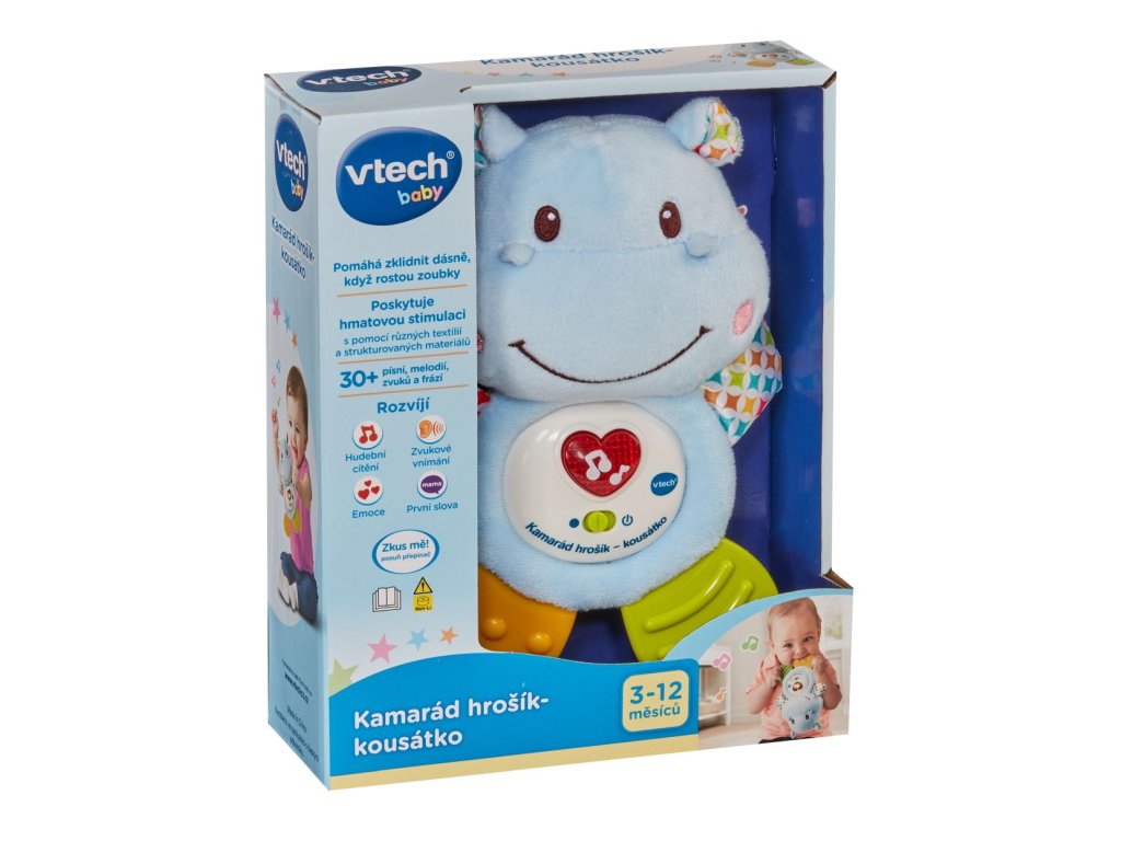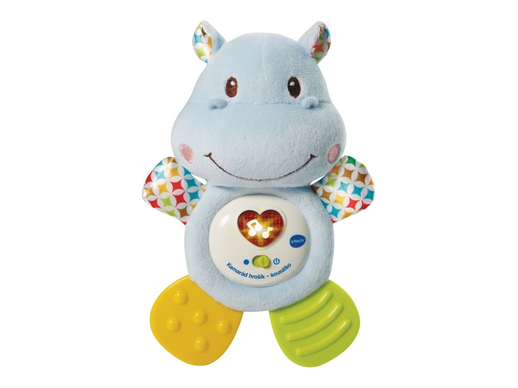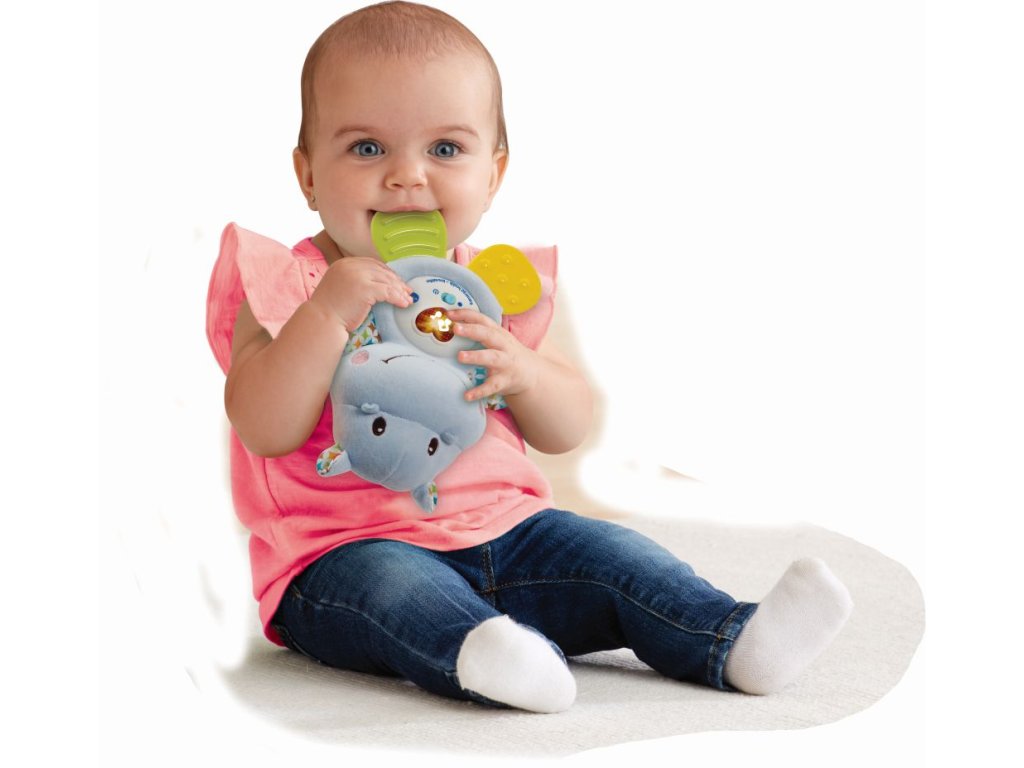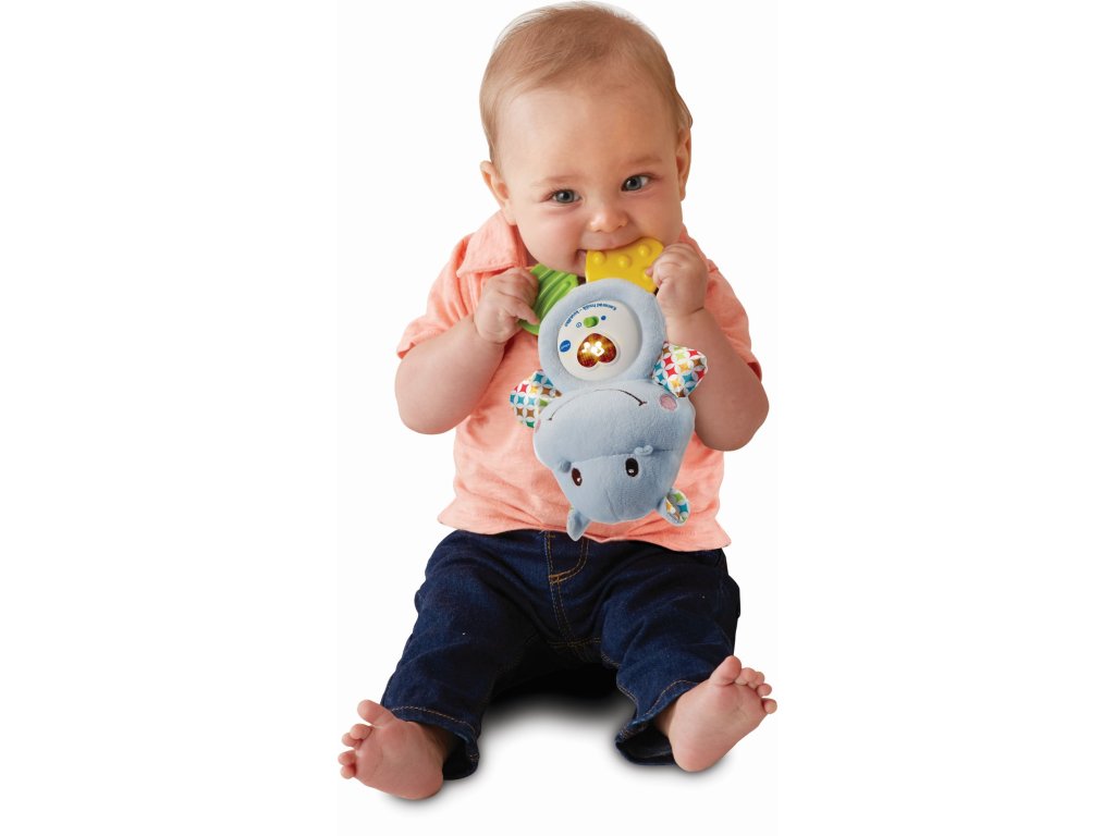 Tento hrošík je ideální pro každé miminko, kterému rostou zoubky. Měkké nožičky i ručičky jsou speciálně vyvinuté k masáži dětských dásní. Hrošík je lehoučký, příjemný na dotek, roztomile mluví i zazpívá. Mačkání svítícího červeného srdíčka rozvíjí interakci a jemnou motoriku dítěte. Po snadném vyjmutí hracího modulu lze hračku vyprat.