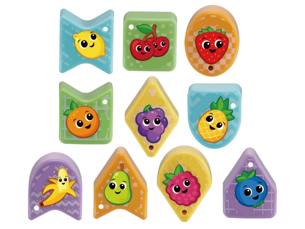 Stiskem stopky se vytváří další, nové tvary. Vkládání tvarů do otvorů rozvíjí koordinaci ruka-oko, prostorové vnímání, logické myšlení, objevování a jemné motorické dovednosti.