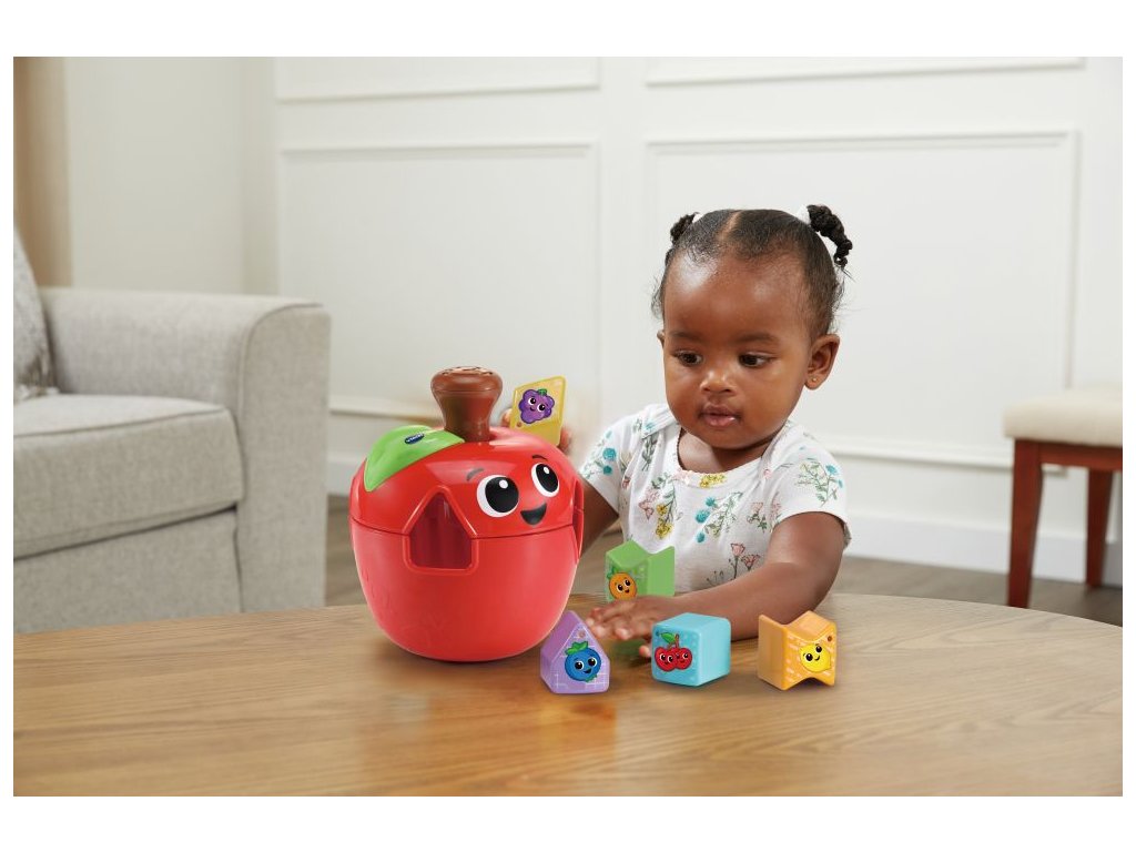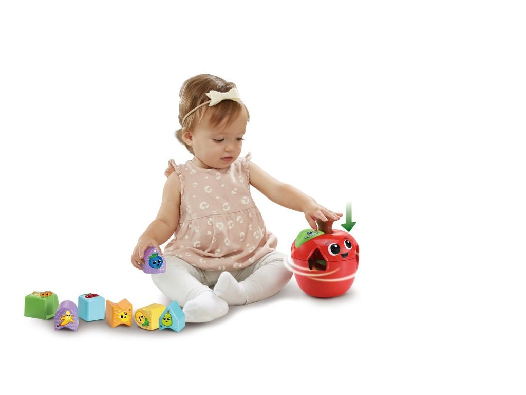 Veselé jablko – to je zábavná vkládačka od VTech® která je vyrobena z 90% z recyklovaných materiálů. Obsahuje 10 jedinečných tvarů, čímž převyšuje úroveň běžných vkládaček. Dítě se učí poznávat různé druhy ovoce i tvary.