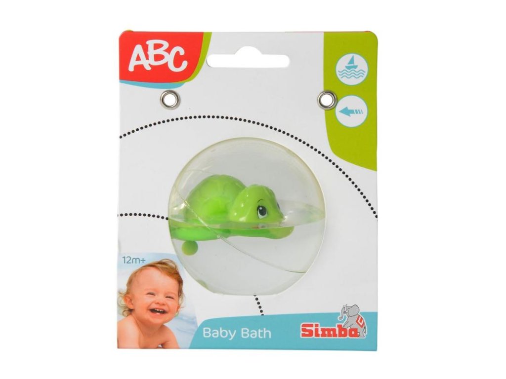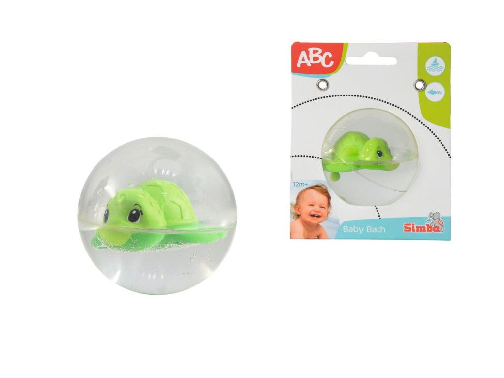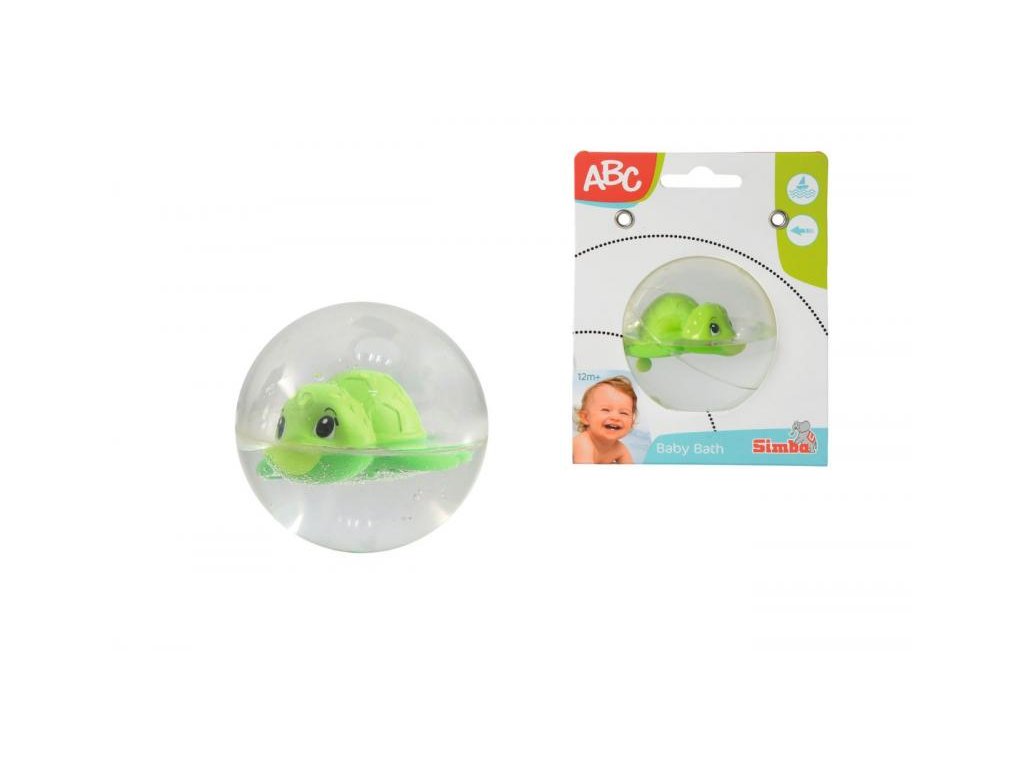 Želvička plave mezi barevnými perličkami v měkké, pružné kouli naplněné vodou. Průměr koule 8 cm.