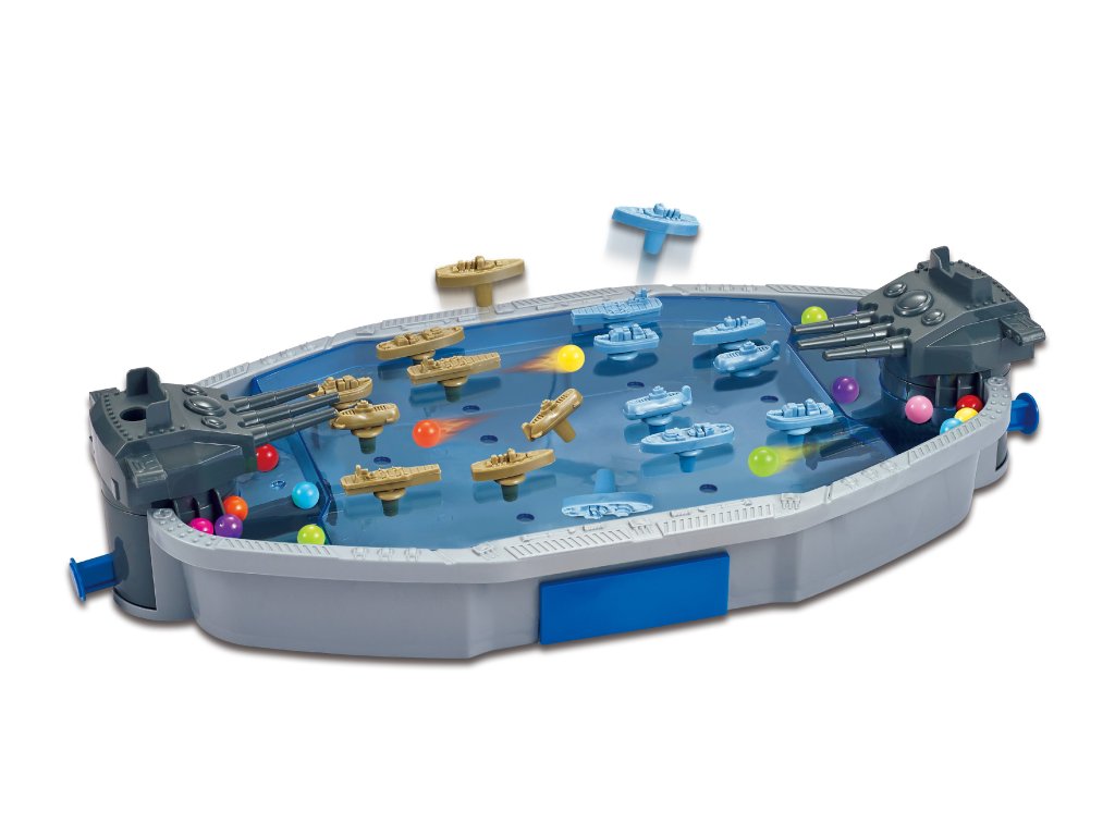 Lodě bitevní, hra pro 2 hráče. Obsah balení: Hrací plocha, 2xdělo, 10x modré plavidlo, 10x zelené plavidlo, 10x modrý kolík, 10x zelený kolík, 30x kulička. Děla nasaďte na každé straně hrací plochy. Plavidla nasaďte na kolíky a libovolně je rozmístěte na své straně hrací plochy. Zásobník děla pojme 7 kuliček. Dělo střílí stlačením modré páčky na zadní straně. Míčky létají pod povrchem hrací plochy. Cílem je trefit kolík, na kterém je nasazeno plavidlo protihráče. Střely létají velkou rychlostí, při zásahu může kolík s plavidlem vystřelit mimo hrací plochu, chraňte oči. Vystřelené kuličky můžete vyjmout dvířky na straně hrací plochy. Dvířka opět zavřete před pokračováním ve hře.