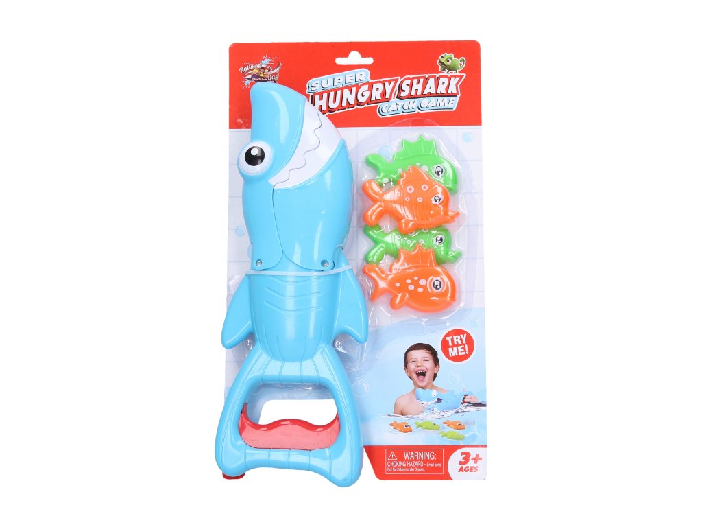 Žralok, lapač rybiček. Balení obsahuje lapač ve tvaru žraloka a 4 rybičky. stisknutím spouště na ocasu žraloka ovládáte jeho tlamu. Try me funkce na obalu.
