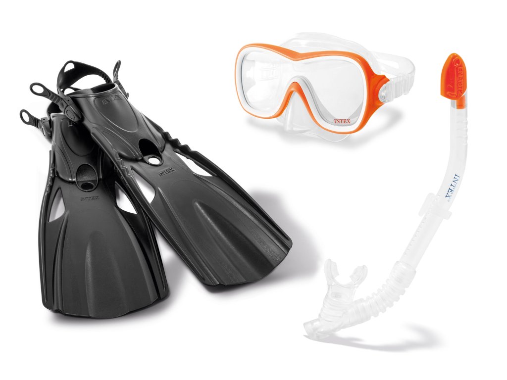 Brýle mají nastavitelný gumový pásek, bezpečná polykarbonátová skla a rámeček z měkké gumy, díky kterým brýle pohodlně sedí na obličeji, ochrana proti ultrafialovému záření a proti zamlžování. Silikonový šnorchl má velice komfortní silikonový náustek středního rozměru s integrovaným vypouštěcím ventilem. Jeho součástí je také úchyt k potápěčským brýlím. Ploutve mají nastavitelný pásek kolem paty, umožňují dynamický odraz, velikost US 5-8.