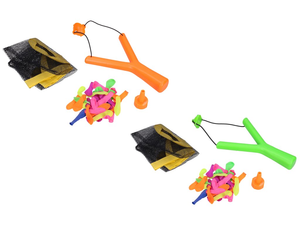 Prak s vodními bombami. Velikost praku 19 cm. Obsahuje prak, 36 balonků, síťovaný pytlík. 2 varianty - zelená, oranžová.