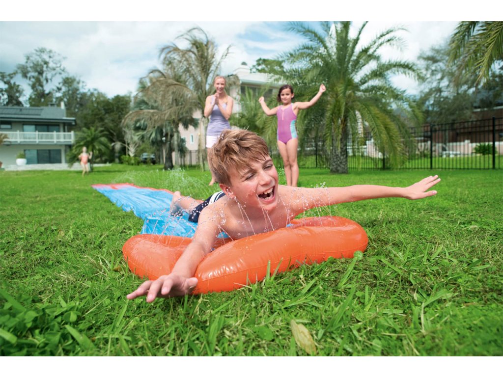 Vodní skluzavka Bestway bude ozdobou vaší zahrady! Připojte se pomocí adaptéru k zahradní hadici a jízda začíná. Téměř pětimetrová skluzavka je ideální pro závodění s kamarády. Na konci skluzavky stéká voda do bazénku, zabudované postřikovače vytvářejí kaskádový efekt a udržují dráhu mokrou. Délka skluzavky: 488 cm. Vyrobeno z kvalitního a odolného vinylu. Skluzavka je vhodná pouze pro domácí použití. UPOZORNĚNÍ. NIKDY NENECHÁVEJTE DÍTĚ BEZ DOZORU – NEBEZPEČÍ UTONUTÍ. POUŽÍVEJTE POUZE POD DOHLEDEM DOSPĚLÉ OSOBY. Balení: 24x24x4,5cm/0,9kg Věk: 3+