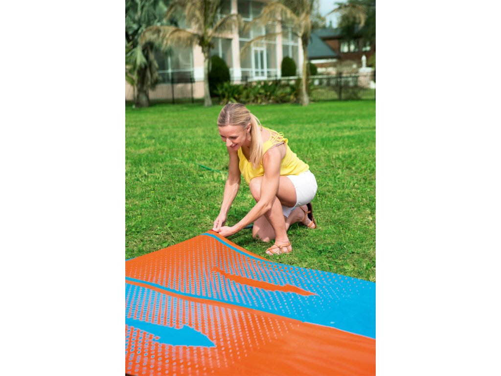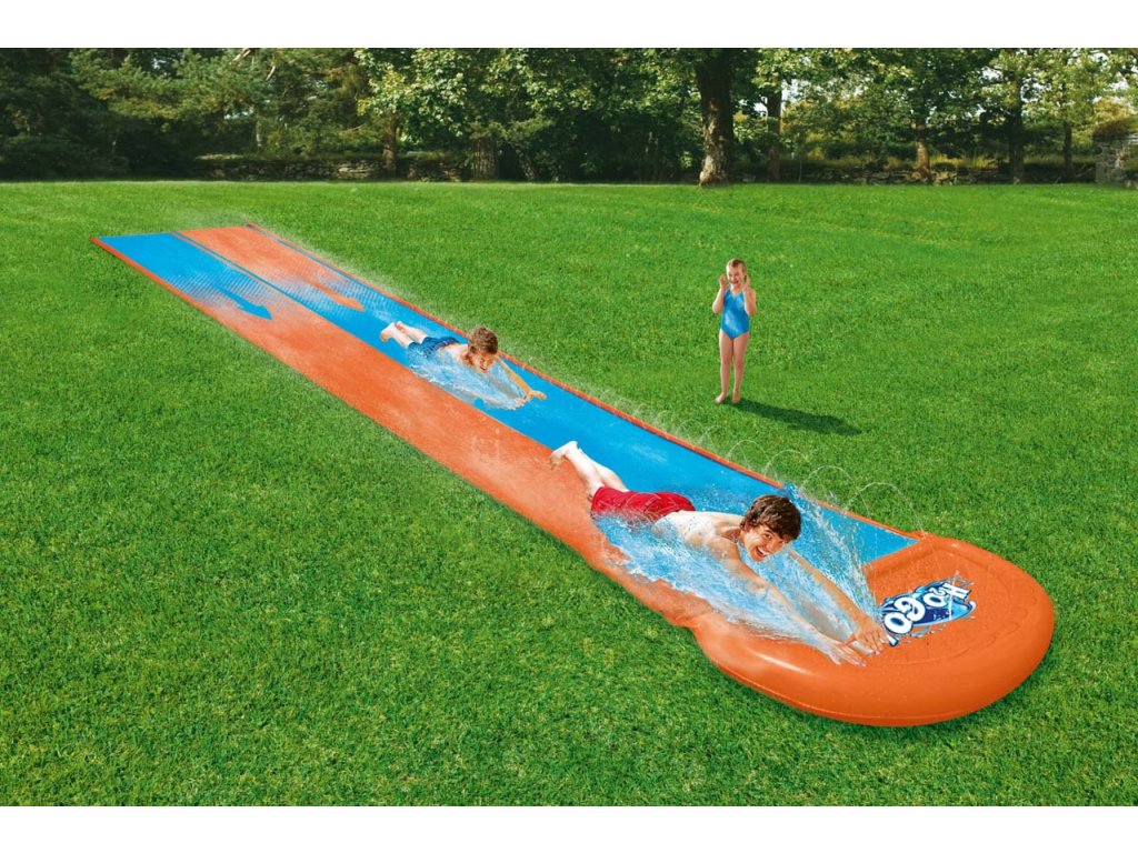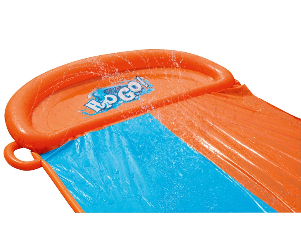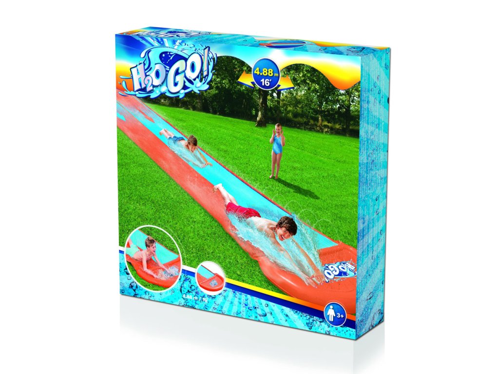 Bestway® H2OGO!® Vodní skluzavka pro 2 osoby 488 x 138 cm. H2OGO!™ nabízí klasickou letní zábavu na zahradě. Díky dvěma dráhám mohou děti závodit na skluzavce. Zabudované zavlažovače SplashBoost™ s připojením na zahradní hadici vytvářejí kaskádový efekt a udržují dráhy kluzké. Na konci skluzavky stéká voda do bazénku, takže v cílí čeká každého mokrá odměna. Součástí skluzavky je vypouštěcí ventil. Děti si užijí hodiny strávené na skluzavce a rodiče ocení, jak snadné je postavit – stačí ho připojit k zahradní hadici a zábava začíná. Vyrobeno z odolného UltraSlick™ PVC. Obsah: 1 nafukovací skluzavka, 1 opravná sada. Délka skluzavky: 488 cm. Šířka skluzavky: 138 cm. Rozměry balení: 30 x 30 x 5 cm. Používejte výhradně venku a pouze pod dohledem dospělé osoby. Věk: 3+