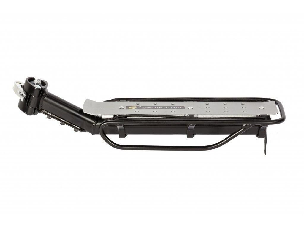 Zadní univerzální nosič 209 na sedlovku využijete pro převoz lehčích nákladů a to zejména v případech, kdy nelze připevnit standardní nosič k rámu kola. Vhodný je například pro celoodpružená kola, kola s atypickou zadní stavbou nebo modely bez návarků a závitů pro zadní nosič. Tělo nosiče je svařené z hliníkové slitiny AW 6061. Postranice jsou neodnímatelné. K sedlovce (s průměrem 25,4-32 mm) se nosič uchytí pomocí dělené objímky a rychloupínáku. Maximální nosnost nosiče je 8 kg. Nosič je vhodný pro brašny Sport Arsenal Art č.505 a 450, na nosič lze použít i brašny jiných značek, plnou kompatibilitu však nelze zcela zaručit. Výrobek prošel zkouškami na speciálním testovacím stroji podle norem DIN. Upozornění: nosič není vhodný na sedlovky z uhlíkových kompozitů! Parametry: -rozměr (d x š x v): 33,5 x 11,5 x 5,5 cm -hmotnost: 710 g -materiál: hliník -nosnost: 8 kg -na sedlovku s průměrem 25,4-32 mm