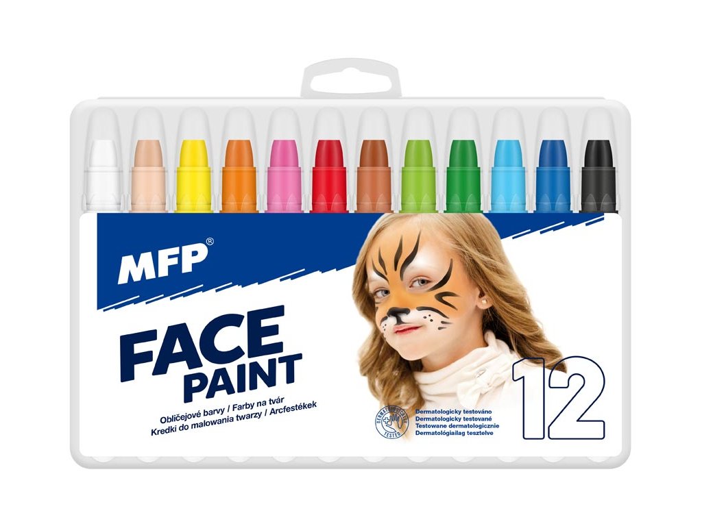 Set 12 ks barev na obličej na principu rtěnky (72 g). Díky těmto pestrým barvám vykouzlíte na tváři dítěte krásnou masku na karneval, párty nebo jinou oslavu. Dermatologicky testováno.BARVY: bílá, červená, žlutá, tmavě a světle zelená, tmavě a světle modrá, černá, tmavě a světle oranžová, růžová, hnědá,NÁVOD NA POUŽITÍ:1. Doporučujeme vyzkoušet barvičky na méně citlivém místě. 2. Dojde-li k podráždění pokožky, nepoužívejte a vyhledejte lékaře.3. Nepoužívejte na rty a oči.4. Barvičkami malujeme na suchou pokožku.5. Jednoduše omyvatelné vodou a mýdlem, barvy zdravotně nezávadné.6. Nedoporučujeme nechávat na obličeji déle než 24 hodin. 7. Při použití doporučujeme dohled dospělé osoby.VAROVÁNÍ:Nevhodné pro děti do 3 let, nebezpečí spolknutí malých částí.Všech 12 ks je baleno v plastové krabičce.Uvedená cena je za 1 balení.
