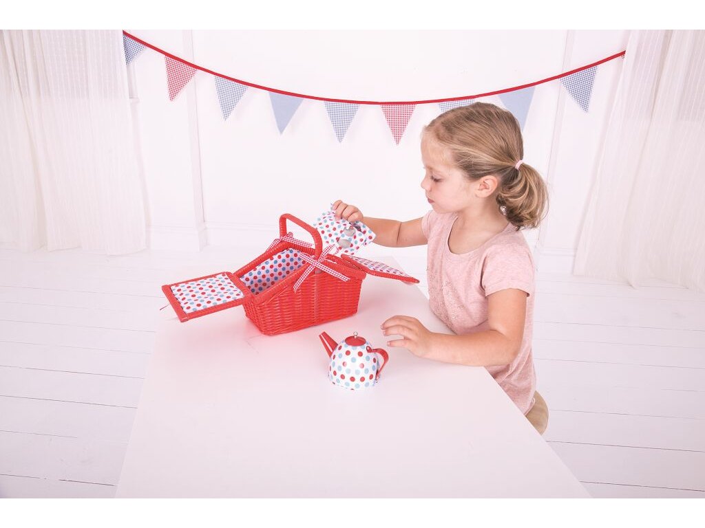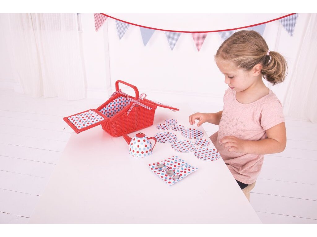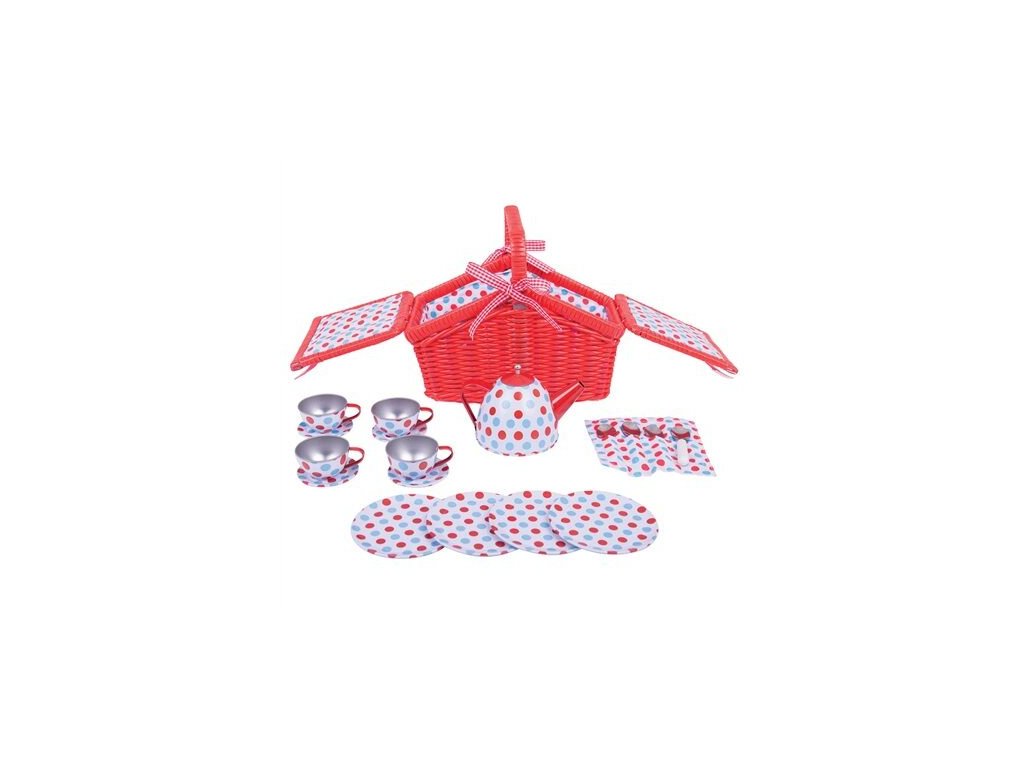 Tato nádherná puntíkovaná čajová souprava obsahuje červený proutěný koš obsahující čtyři šálky a talířky, čajovou konvici s odnímatelným víkem, plus čtyři boční talíře a čtyři lžičky v obalu. Sada obsahuje vše, co dítko potřebuje k čajovému dýchanku. Vhodné i na cesty. Skvělý způsob, jak povzbudit kreativní a nápadité hraní rolí. Odpovídá současným evropským bezpečnostním normám.