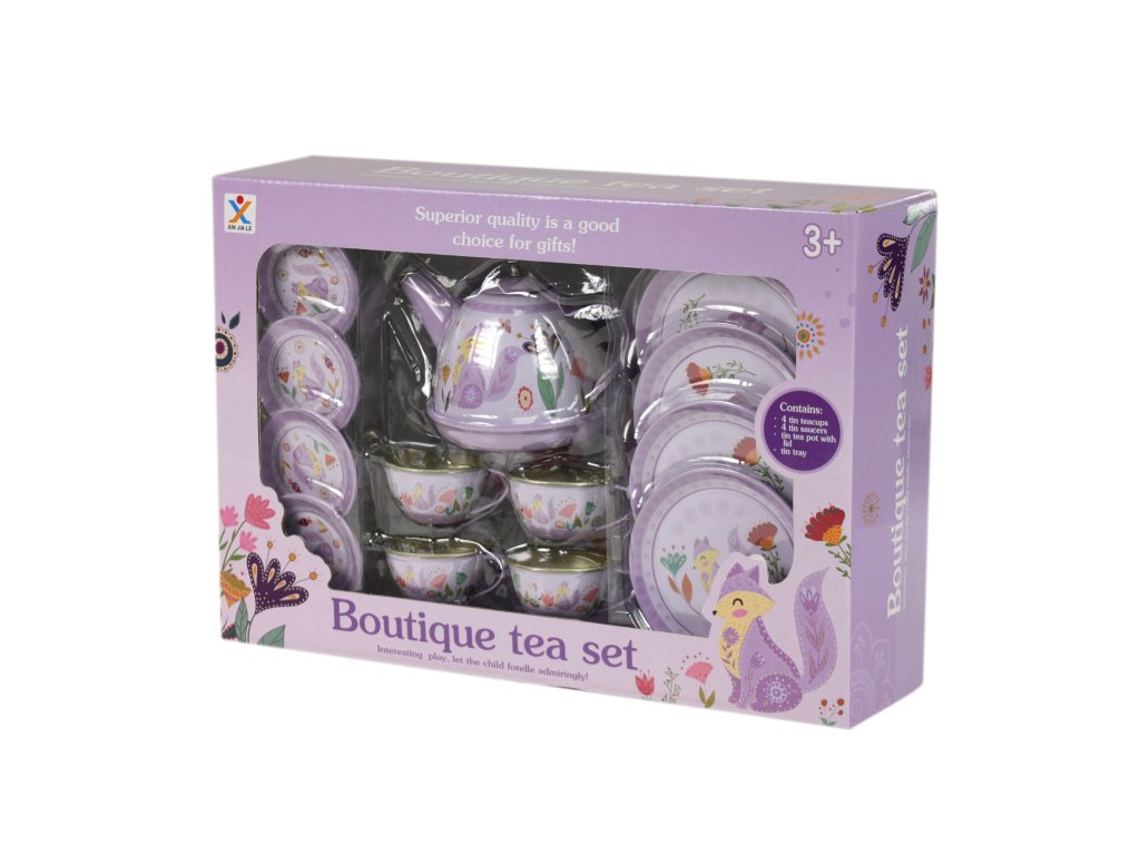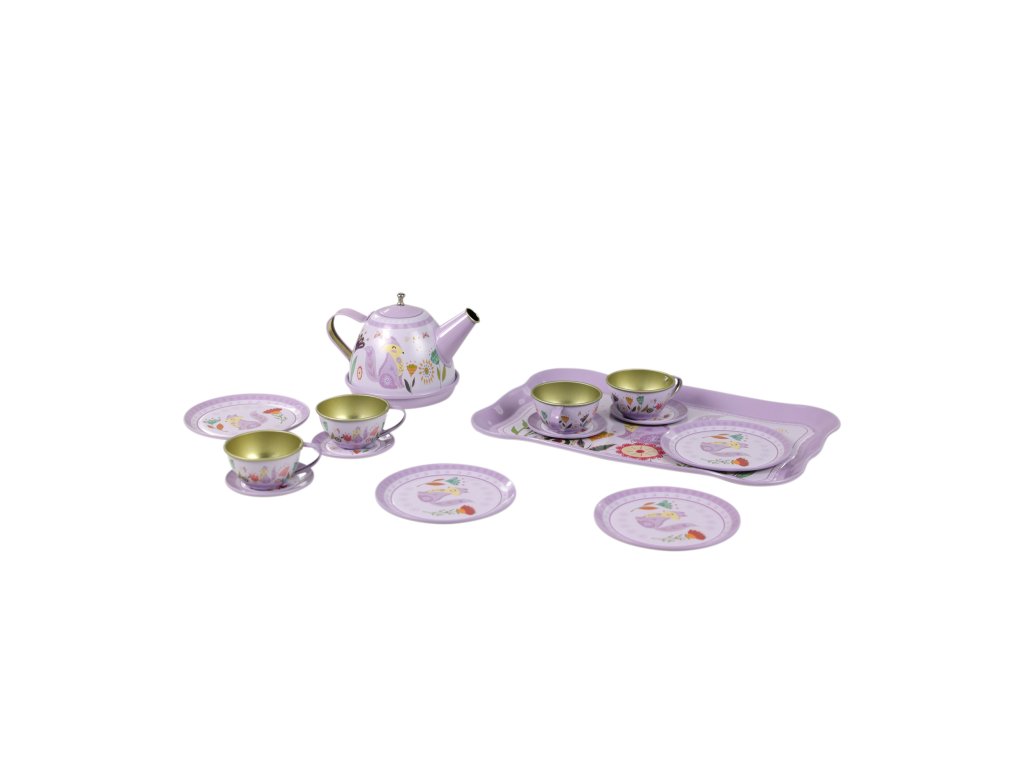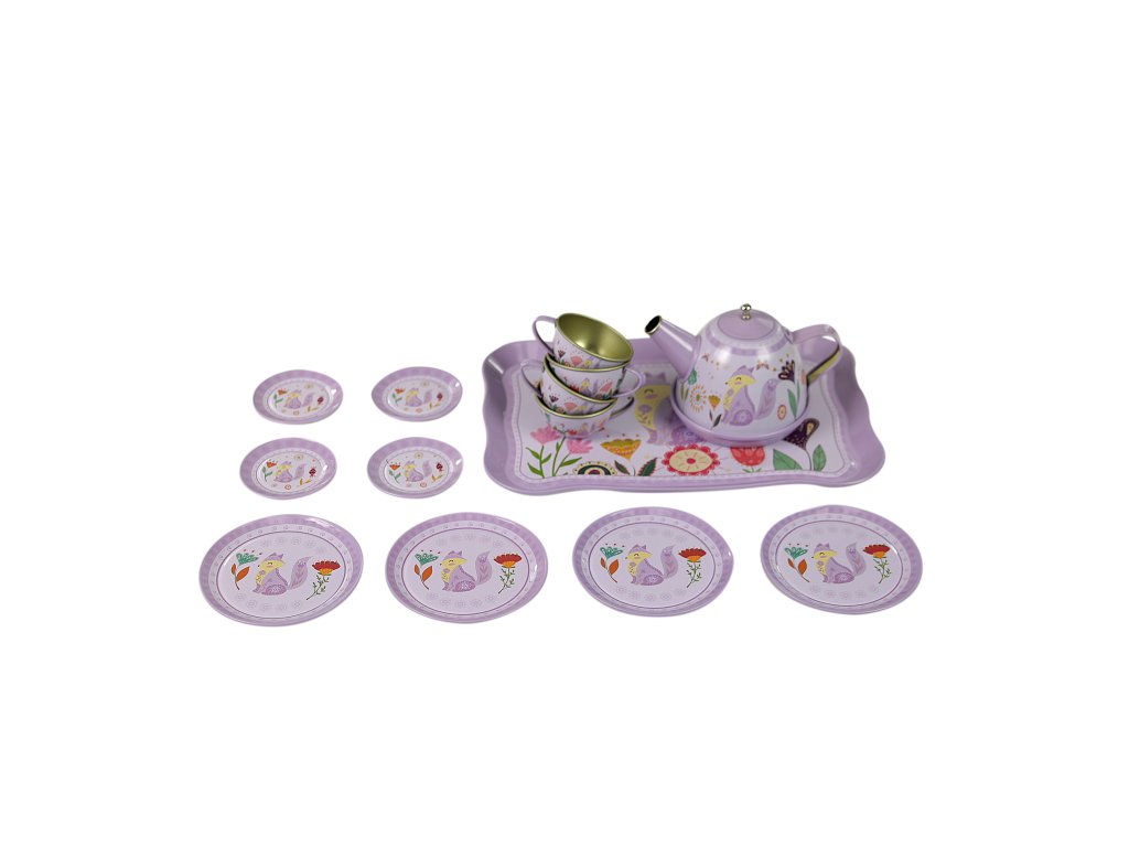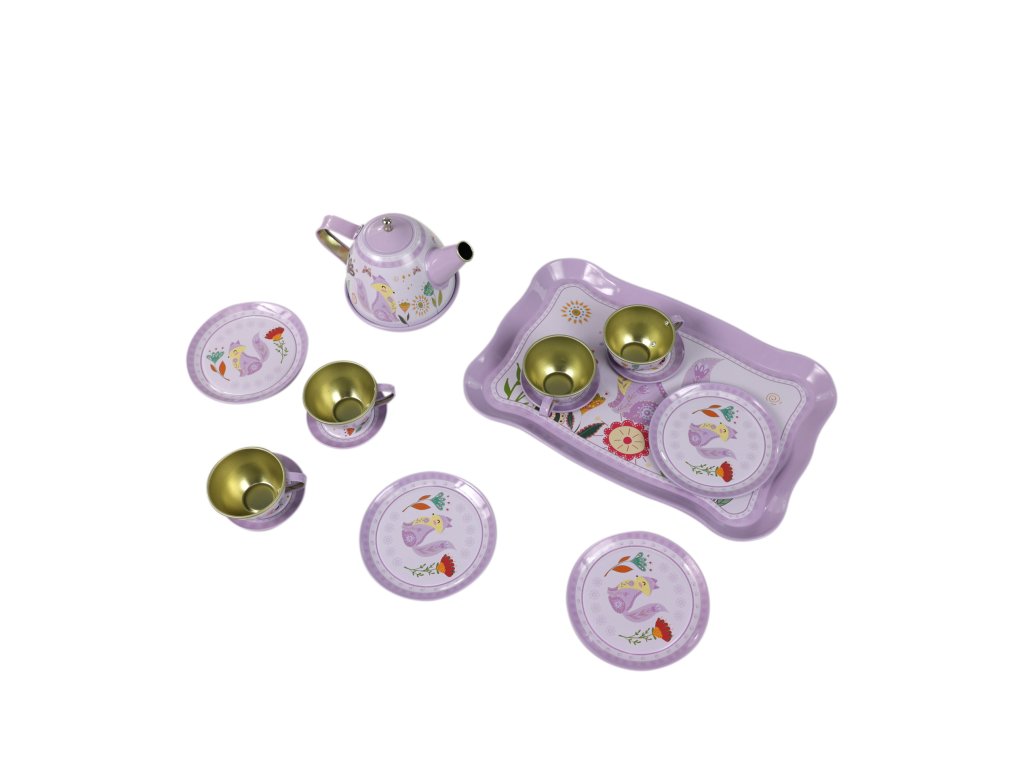 Krásný kovový čajový set ve fialovém provedení. Tento set obsahuje tác, konvičku, 4 větší talířky, 4 menší talířky a 4 hrníčky.