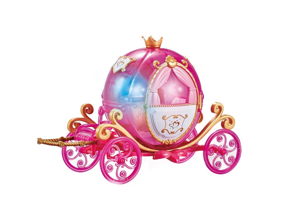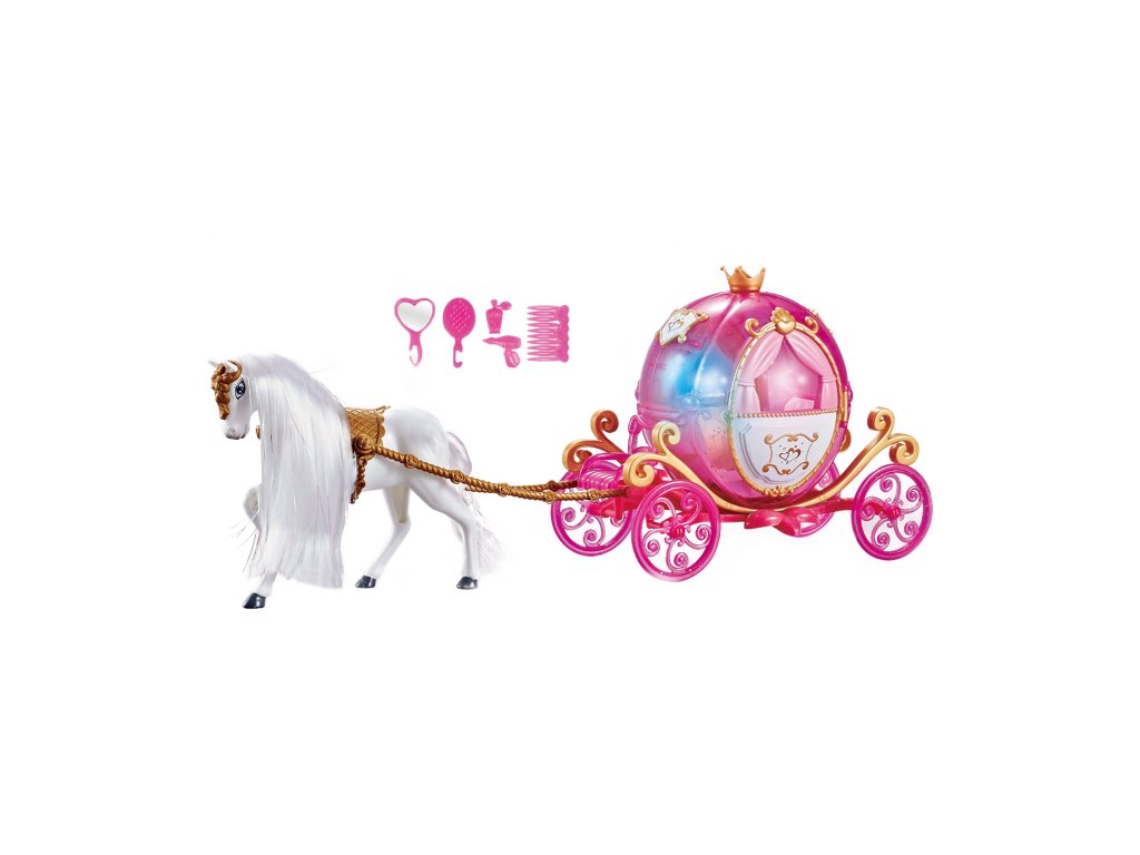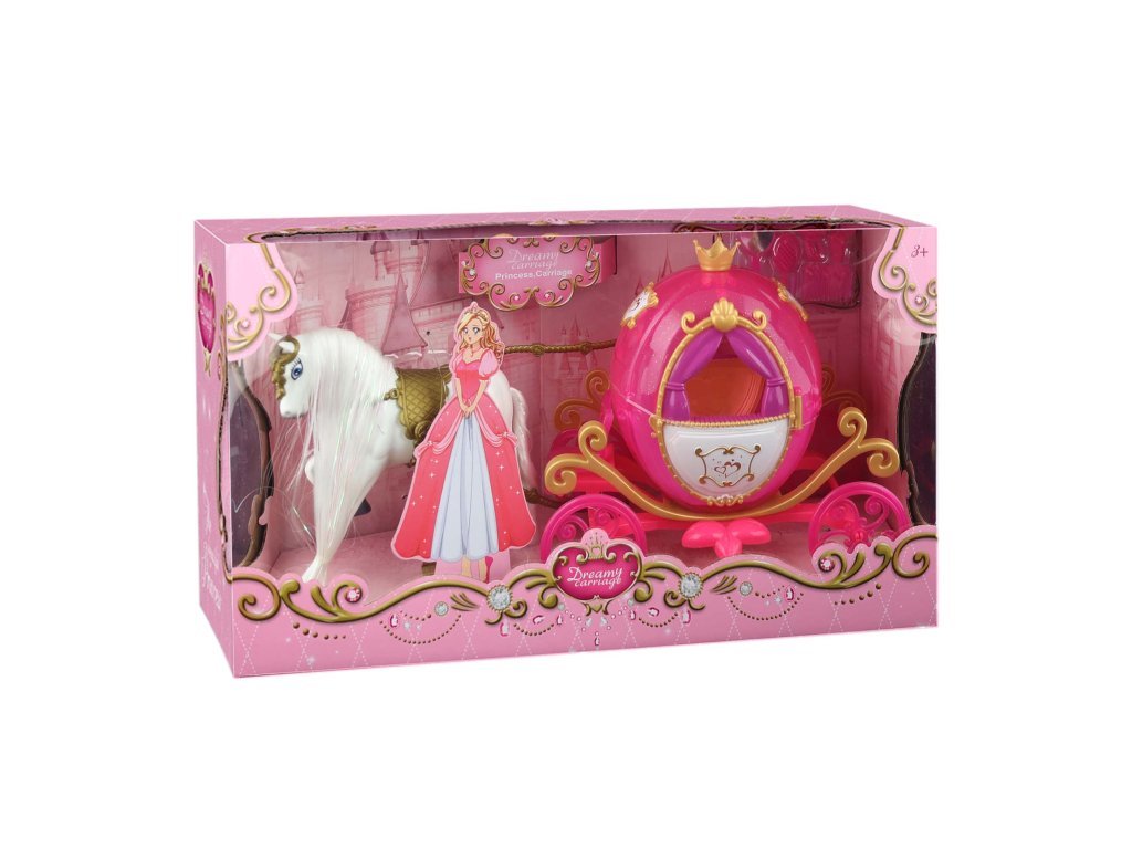 Bílý kůň s dlouhou hřívou zapřáhnutý do růžovéhop pohádkového kočáru. Každá panenka si bude přát vyrazit v něm na zámecký bál! Kůň má krásnou bílou hřívu, kterou můžeš česast přiloženými hřebeny. Kočár funguje na 3x1,5V baterie typu AG13, po zapnutí vydává reálné zvuky, hraje hudba a bliká. Baterie jsou součástí výrobku.