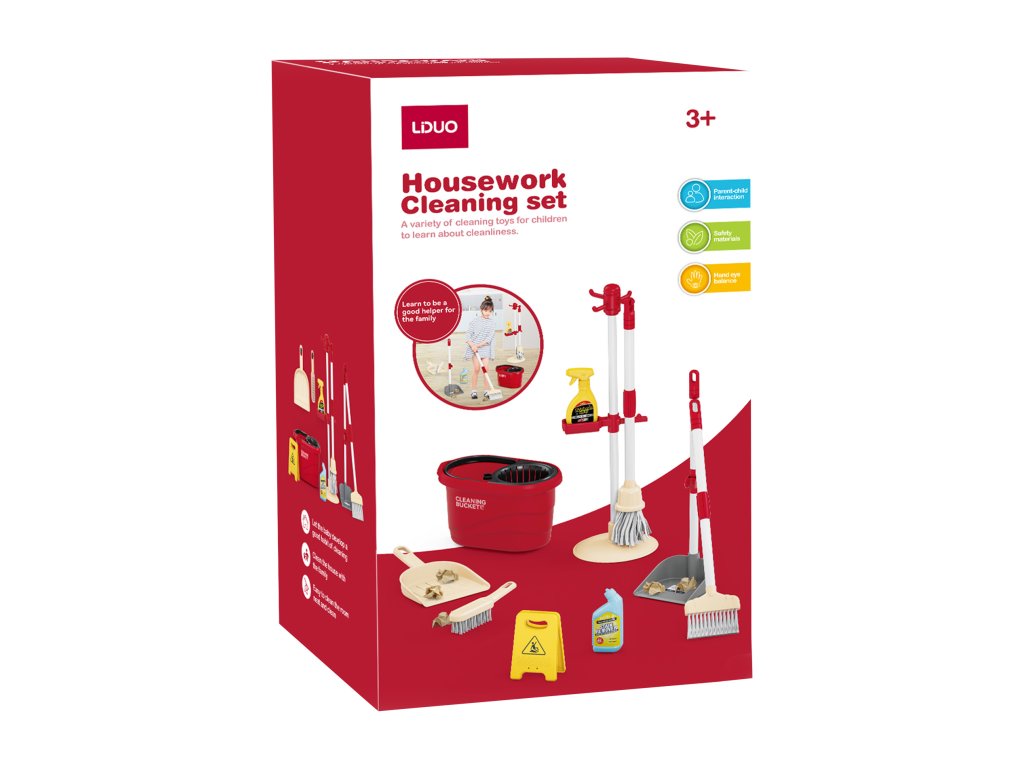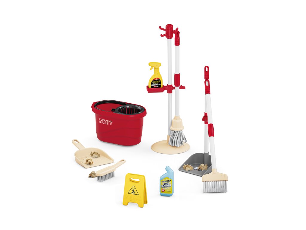 Díky této dětské uklízecí sadě se domácí práce stanou velkou zábavou! Sada pomůcek na úklid pro malé hospodyňky je vyrobena z kvalitního plastu. Sada obsahuje velký smeták, mop, smetáček s lopatkou, kyblík a nádoby jako čistící prostředky. To vše spolu i s praktickým stojanem najdeš v této báječné sadě.