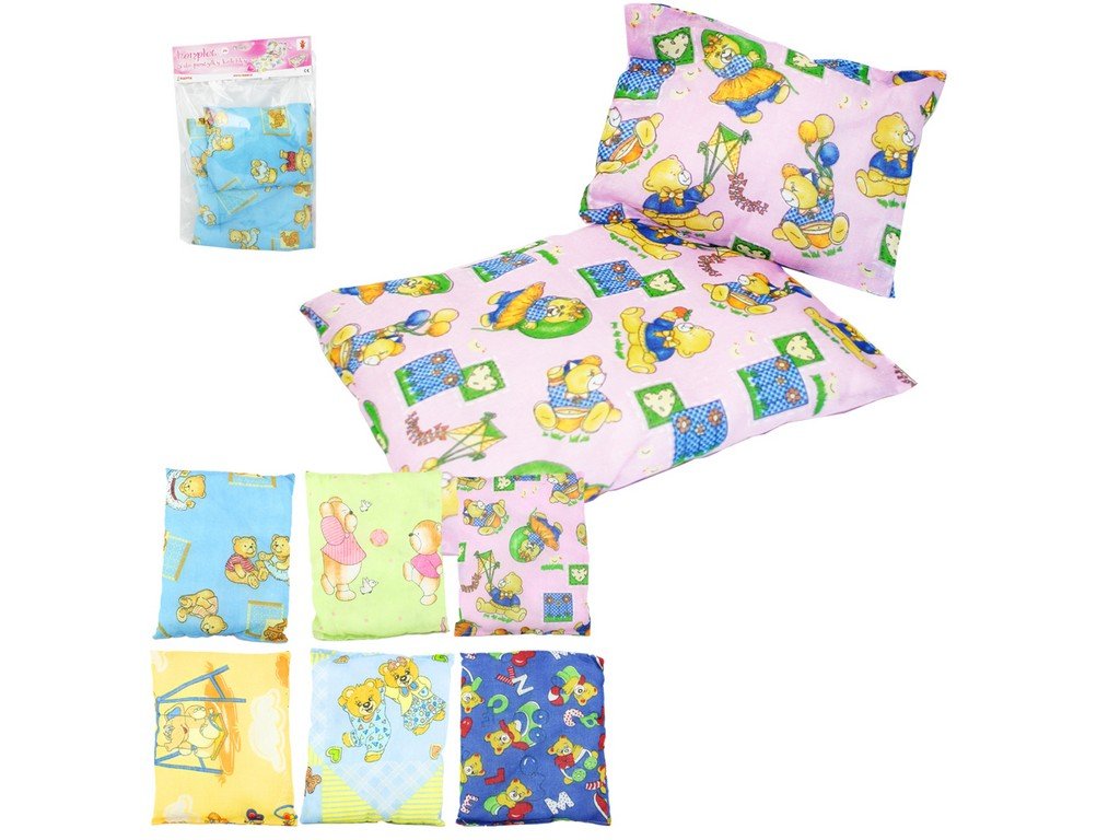 Barevný set do postýlky nebo kolébky pro panenky. Obsahuje přikrývku a polštář. Barvy i vzory se mohou lišit od vyobrazení.