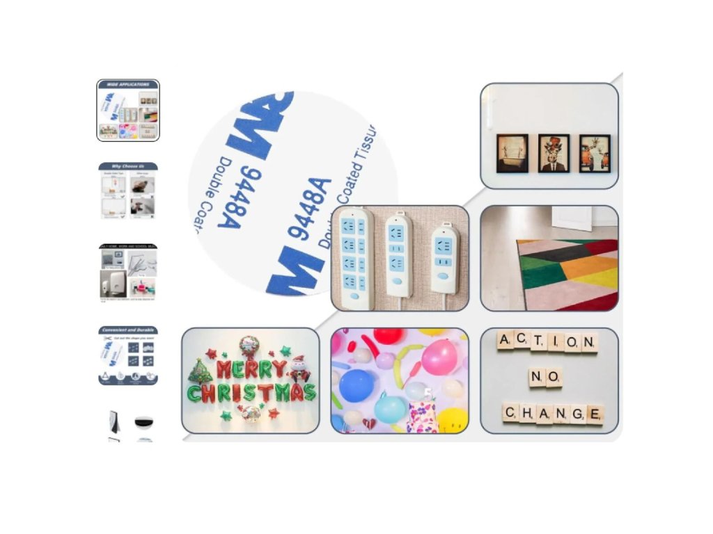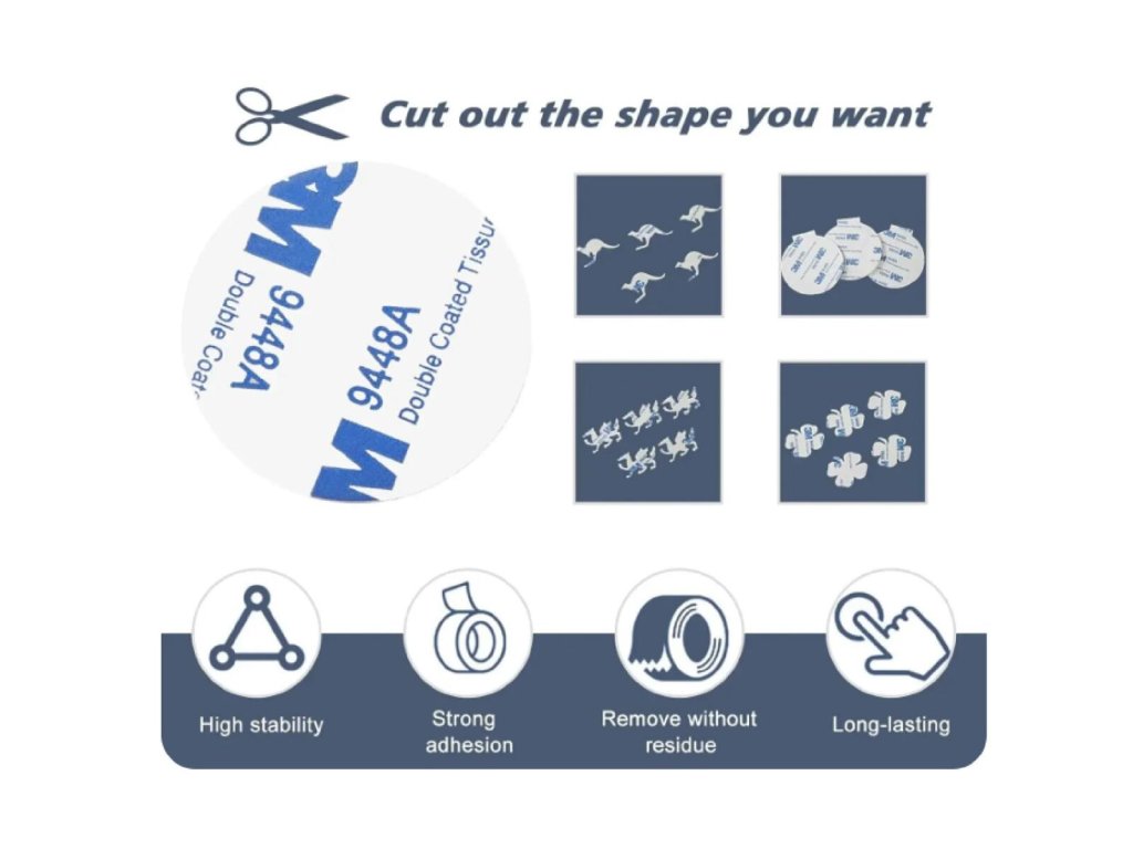 Sada 3M Fix Plates obsahu 4 kusy oboustranných pěnových samolepek různých tvarů pro montáž drobných věcí na hladkém povrchu jako sklo, kov, dlažba, dlaždice, latexová barva apod. Akrylové pásky o síle 1,5 mm využijete v domácnosti či v autě. Jejich výhoda je rychlá montáž, dobrá přilnavost a eliminace viditelných spojovacích prvků jako jsou šrouby či nýty. Samolepky také můžete zkrátit nůžkami dle potřeby. Balení obsahuje samolepky o rozměrech: 1x .... 25 x 25 mm 1x .... 55 x 42 mm 1x .... průměr 40 mm 1x .... průměr 50 mm Použití: - Důkladně očistěte a osušte povrch. - Odtrhněte ochrannou fólii a přilepte pásku k povrchu. - Odstraňte druhý bezpečnostní papír. - Nalepte na něj vybranou položku. - Při použití těžších věcí použijte více samolepek.