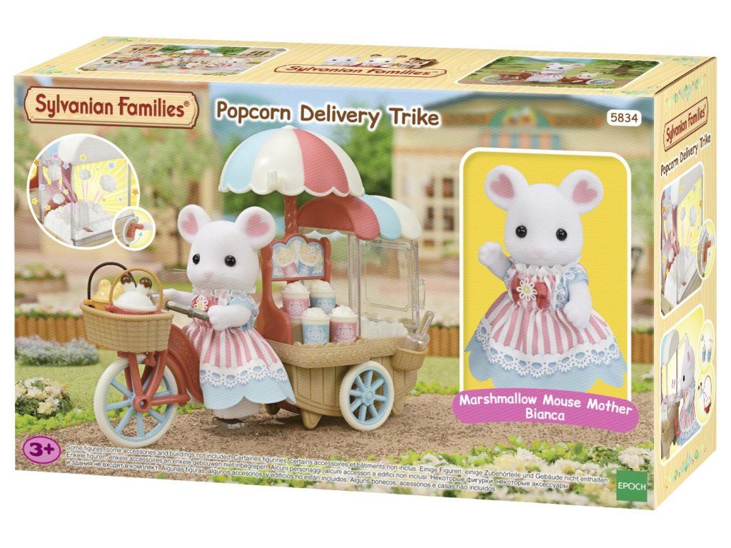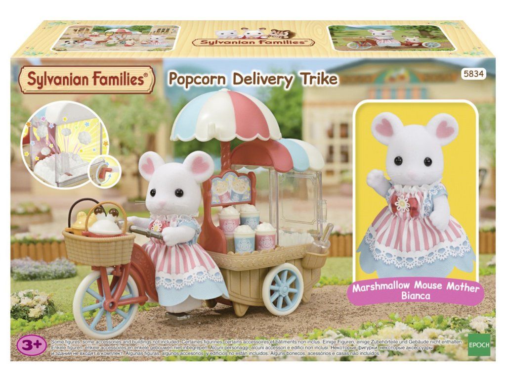 Sada Popcorn pojízdný stánek obsahuje figurku maminky Biancy z rodiny Marshmallow myšek v krásných šatech, tříkolku s popcornem a veškeré příslušenství potřebné k tomu, abyste si mohli užívat obsluhu stánku s popcornem. Otočte rukojetí na popcornovači, aby popcorn poskakoval nahoru a dolů. Hračky Sylvanian Families rozvíjejí představivost a povzbuzují děti k hraní rolí. Hra s figurkami rozvíjí kreativitu a učí emocím vytvářením a vyprávěním příběhů založených na každodenních zážitcích a pozorování světa. Vyznačují se nejvyšší kvalitou a výjimečným důrazem na detaily. Figurky Sylvanian Families jsou pokryté měkkým semišem, mají pohyblivé končetiny a hlavu. Oblečení lze z figurek sundat a vyměnit za jiný outfit. Baleno v krabičce. Rozměry balení: 15 x 24 x 7 cm. Věk: 3+