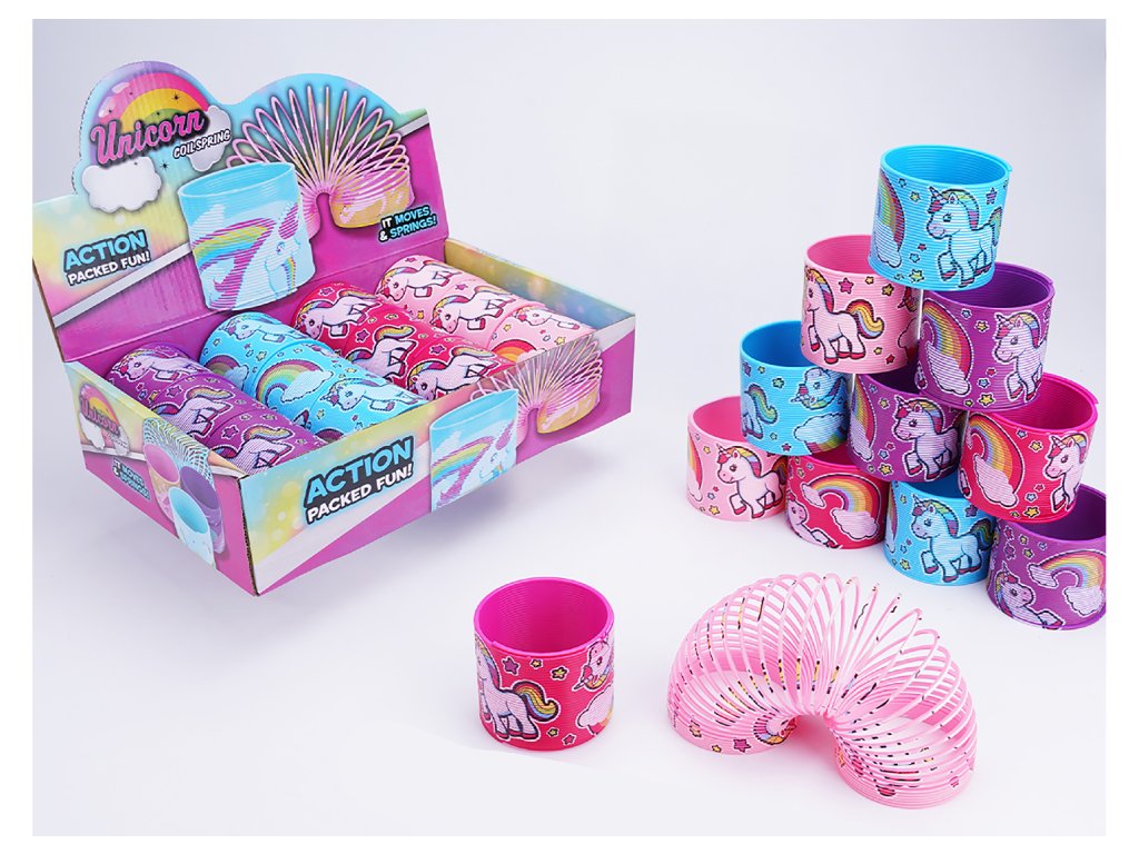 Pružina jednorožec. Přesné rozměry 7,6x7,6x6,5 cm. Display box 12 ks. 4 varianty - modrá, fialová, červená, růžová.