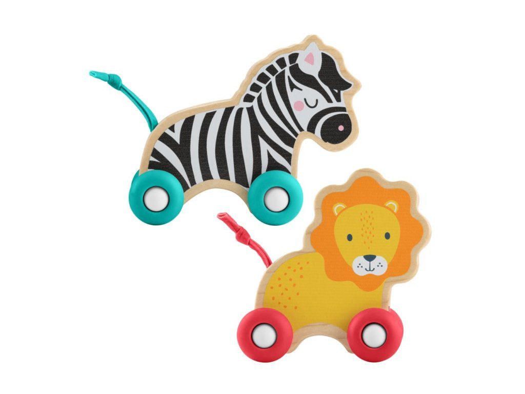 S těmito dřevěnými zvířátky od Fisher-Price® poroste hra spolu s vaším děťátkem od hry vsedě až po zábavu při plazení a běhání. Díky volně se otáčejícím silikonovým kolečkům mají tato vozítka s motivem lva a zebry tu správnou velikost, aby je děti mohly uchopit, vozit a tlačit, a pomáhají tak posilovat jejich jemnou i hrubou motoriku. Tato sada zvířecích kamarádů je vyrobena ze dřeva pocházejícího ze zdrojů s certifikací Forest Stewardship Council (FSC C004225).