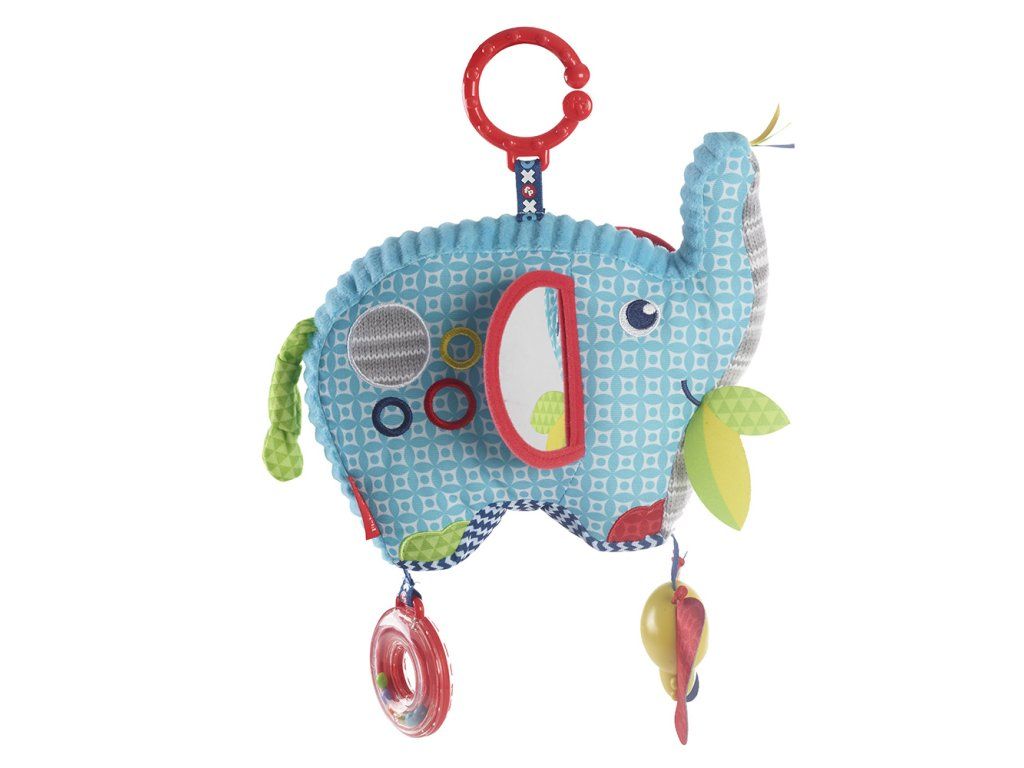 Velký měkký slon se stane nerozlučným kamarádem a prvním společníkem vašeho miminka. Hračka je vyrobena z různorodých materiálů, jako je šustivá látka, manšestr či plyš a má na sobě různé záhyby, což vše rozvíjí hmat. Sloník v sobě skrývá spousty překvapení. Když s ním děťátko zatřese, ozývají se zábavné zvuky. V oušku slona najdete zrcátko, díky kterému budou děti nadšeně objevovat samy sebe. K dispozici je také chrastítko nebo barevný motýlek, který pohupuje nohama. Sloníka můžete vzít všude s sebou. Stačí ho přichytit k tašce nebo ke kočárku. Hračka pomáhá dětem rozvíjet smysly a reagovat na nové podněty, jako jsou jasné barvy a vzory. Hmat a jemnou motoriku si děti procvičují při uchopování a prozkoumávání hračky.